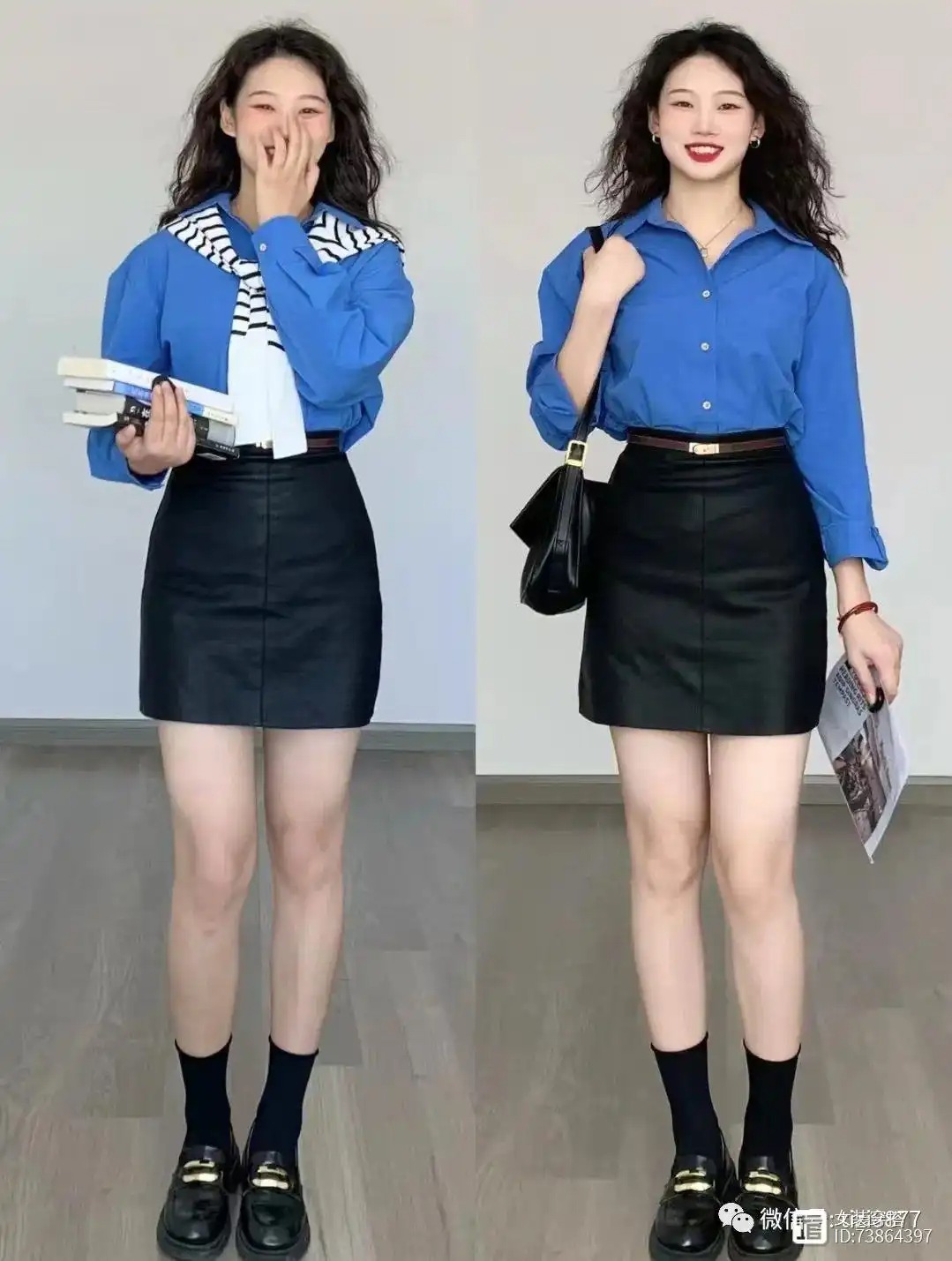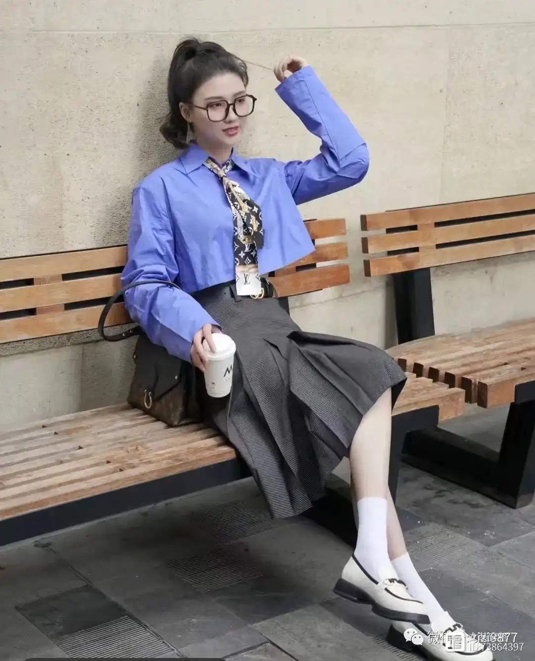 韩里韩气的蓝色设计感衬衫搭百褶裙真的好减龄,秒变韩高学姐,再搭了一双米白色的乐福鞋,鞋型很显脚小,皮质软软,逛街舒适感拉满。