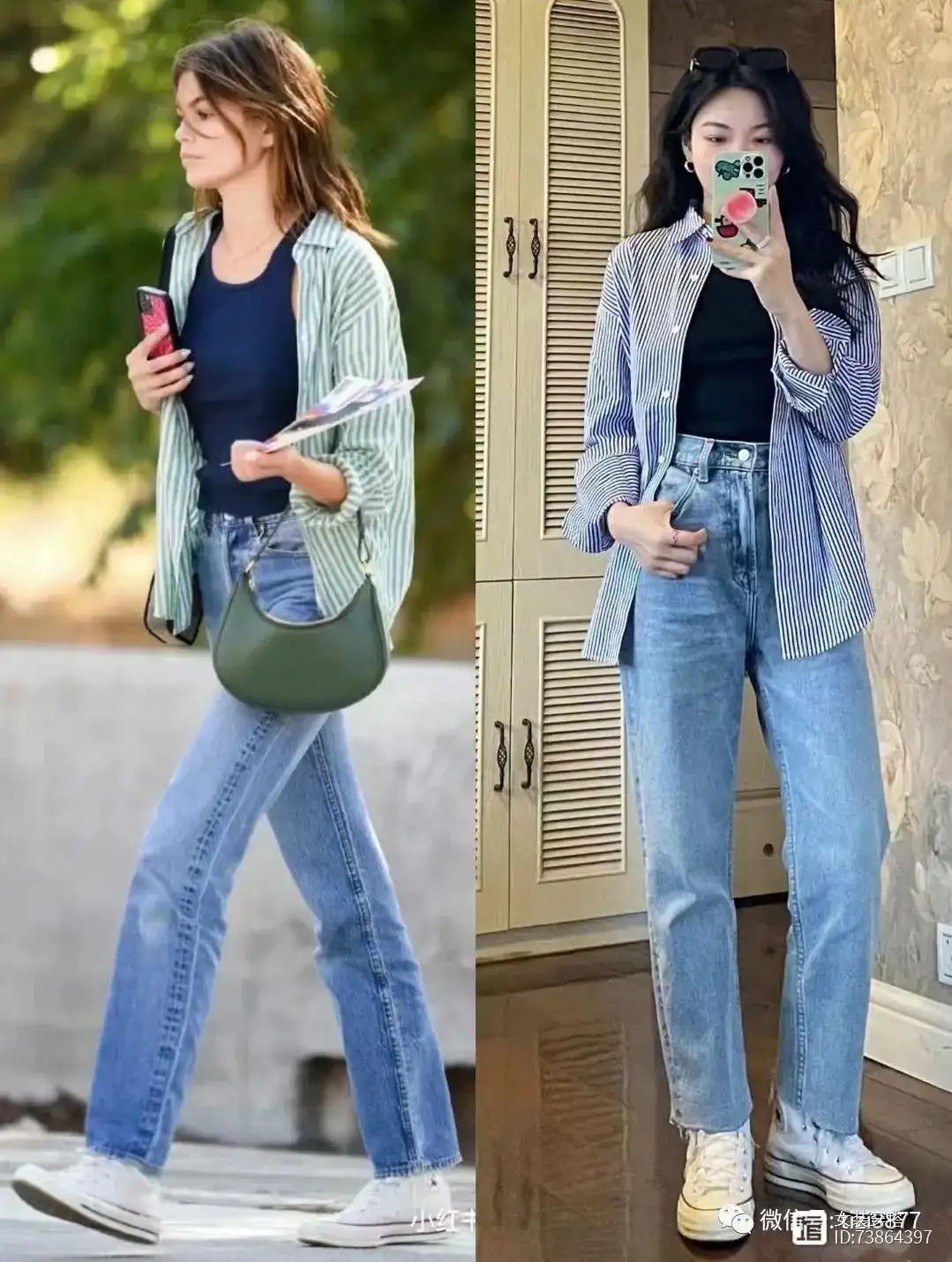经典条纹衬衫,是春夏季节的时髦单品,相比于塞进裤子里,把衬衫当外套里面配背心或T恤,会更休闲更随性,搭配高腰直筒牛仔长裤还更显瘦。