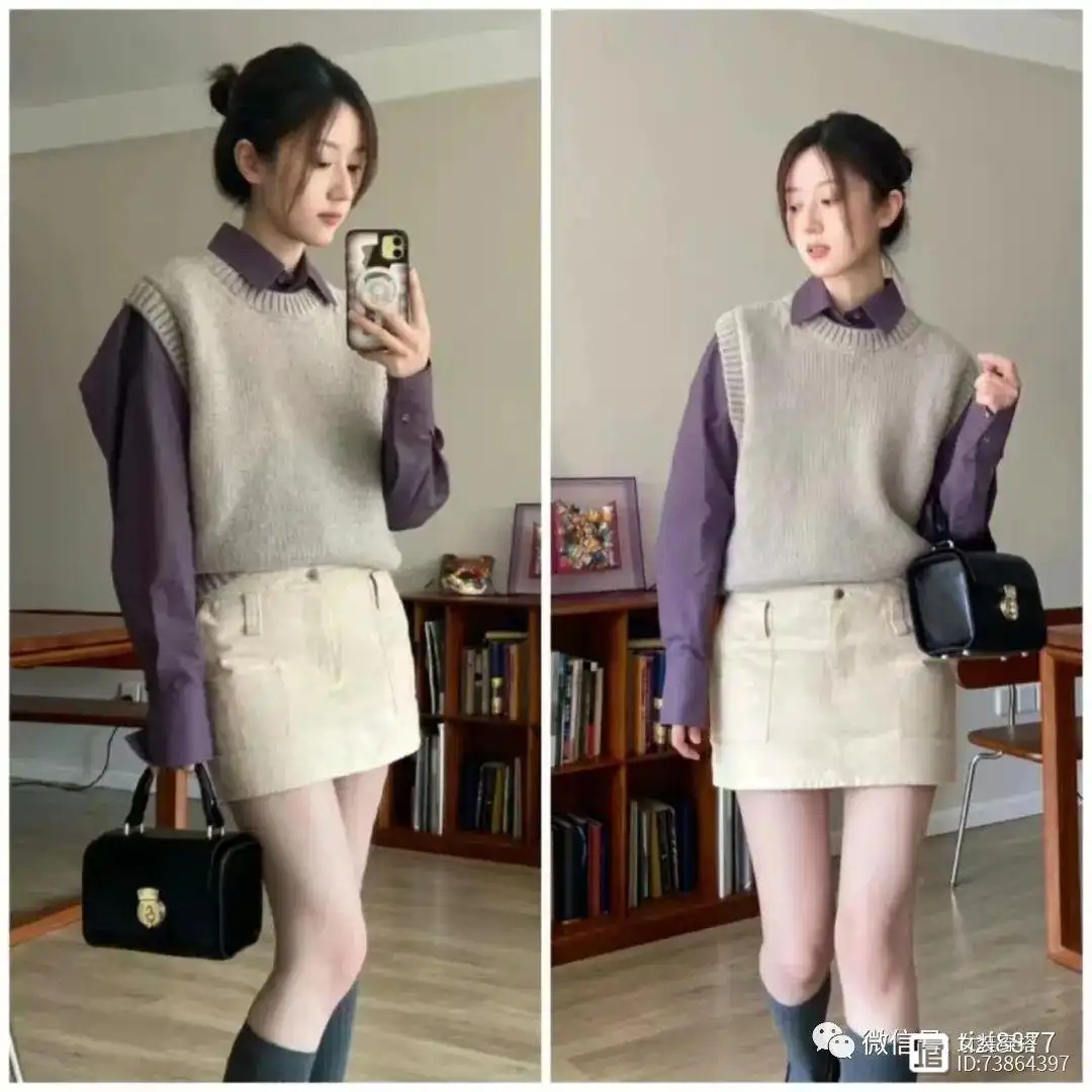 look2 暖灰色针织马甲+内搭紫色衬衫