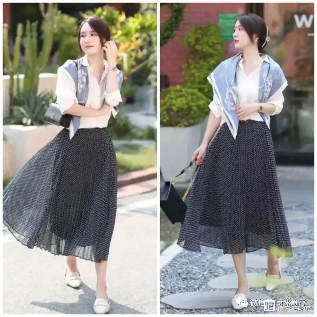 真丝白衬衫和真丝的丝巾就是绝配,让look更加丰富不呆板,波点的半身裙轻盈飘逸,搭配舒适的米色小高跟和金属手表,精致感满满。