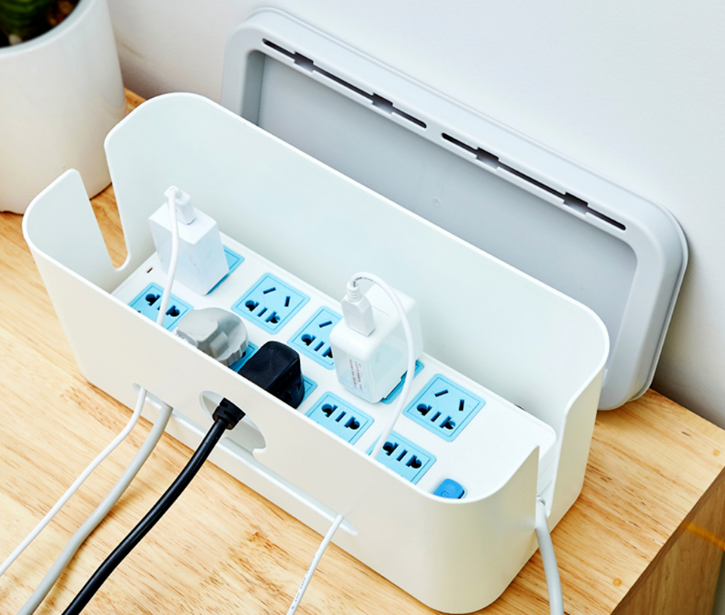 如果是办公桌和电视机旁边,可以选择大号的盒子,将多个插线板和电线都收进去。