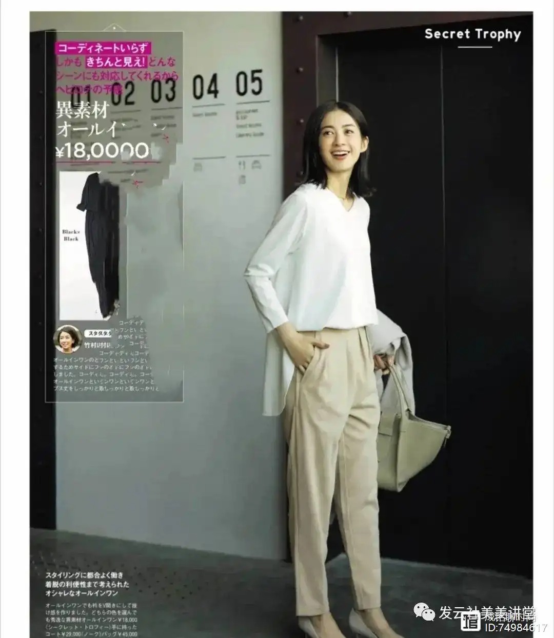 裤装的选用一定不能过于窄小,以这款九分裤为主,颜色方面的使用很简单,却相当百搭,完全能成为女性的爱用好物之一,特别容易修饰腿型。