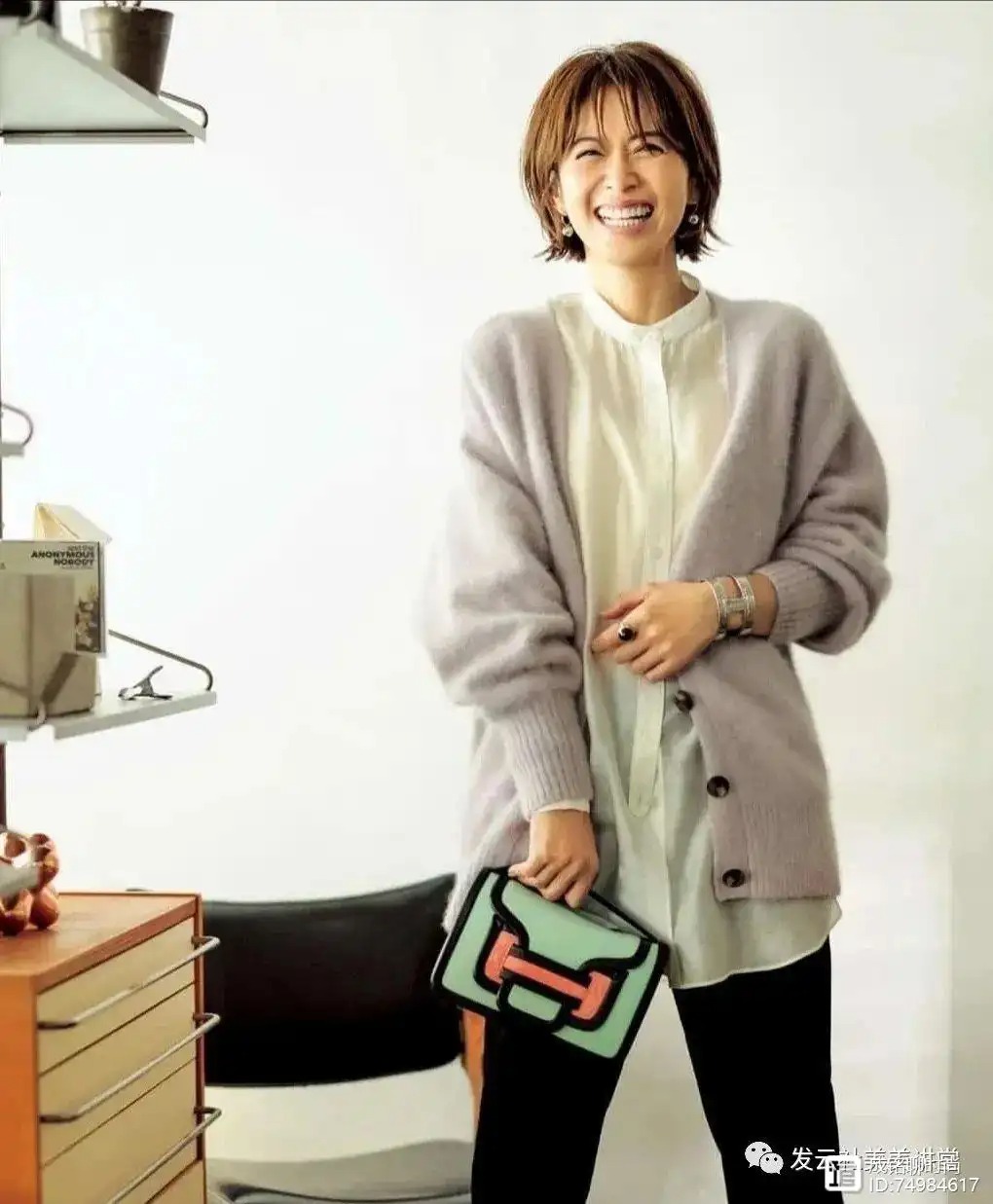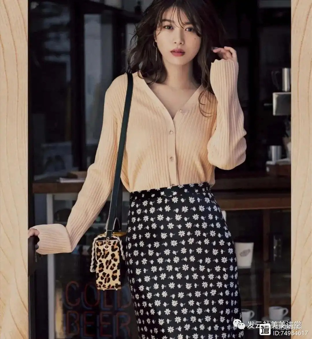 这款针织衫也能在打造出温柔作用的同时带来减龄的效果,这位女士直接配合了一款包臀半身裙,通过腰部位置的协调和臀部轮廓的描绘来营造出更加有曼妙感的曲线。即使是梨型身材的女性,也能借由这种穿搭传递魅力。