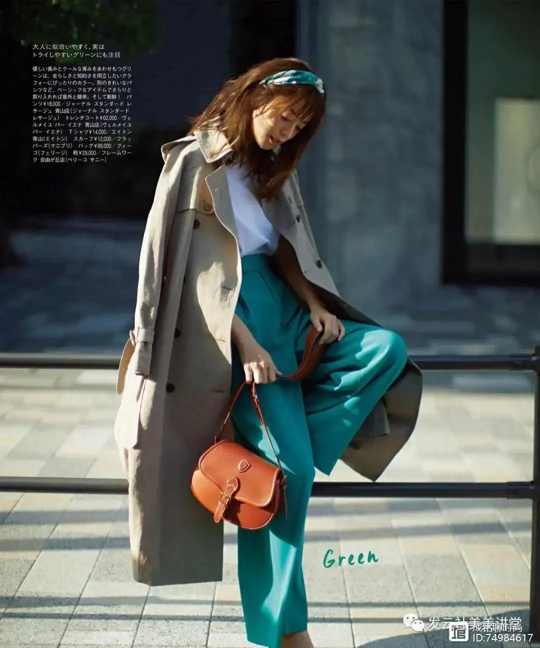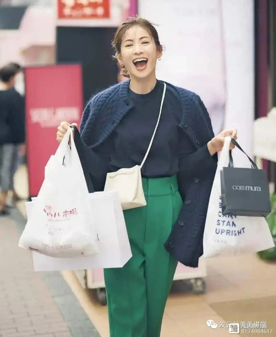 像这条绿色的长裤,从裤型方面的打造来说,它是对腿型比较包容的一类单品,但颜色赋予了它更高的存在感,在上半身可以配合深蓝色或者是黑色的单品,不会显黑。