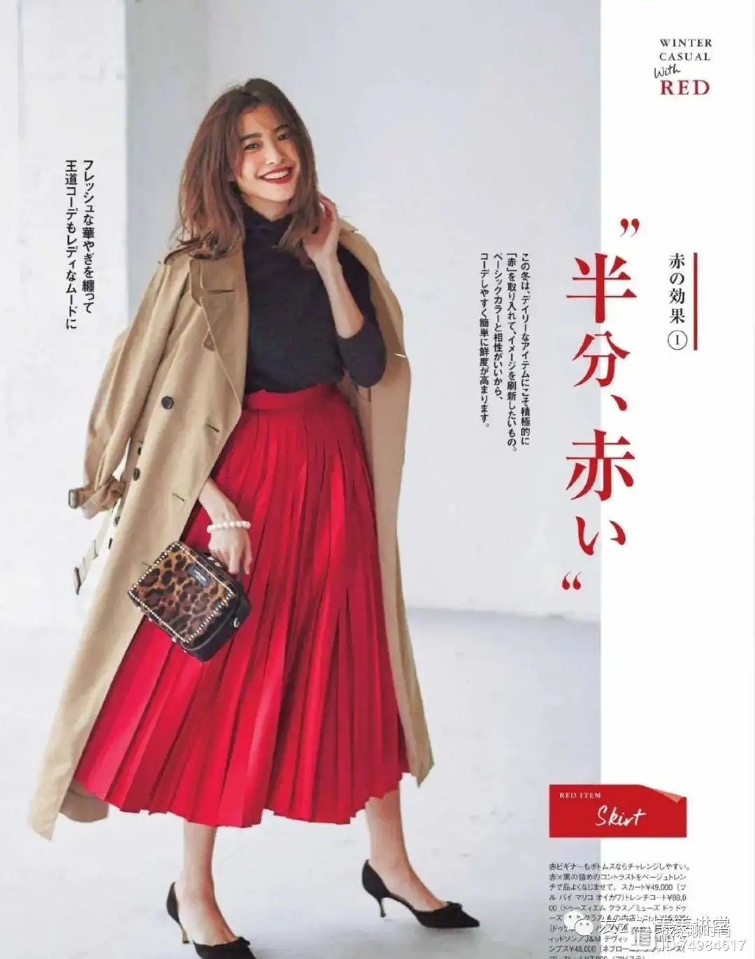就拿这条大红色的半身裙来说,它是一款张扬无比的单品,展现出既优雅又明艳的风格,上半身匹配色系简洁而大众的单品,以卡其色长风衣和黑色内搭为主,就不会营造过多的驾驭压力,还能借由辨识度高的裙装,让着装更新颖。