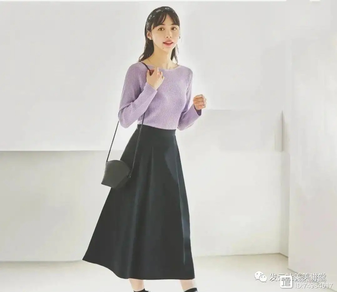 例如这件紫色的针织上衣,它能够透露出饱满的身材线条,结合经典的黑色高腰裙,展现出凹凸有致的曲线,在呈现出十足优雅美的同时,让女性尽显成熟魅力,这样的着装可以在多个场合运用,腿粗的女士也可以直接采纳。