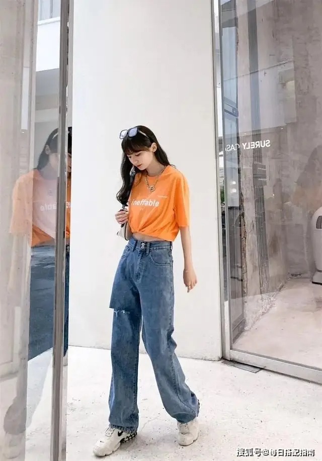 在选择有一定宽松程度的直筒裤是尽量选择高腰的,其实在日常生活当中,任何一种搭配方式尽量都要强调一下高腰线,对于梨型身材的女生来讲,这件事情更加重要,因为最突出的优点就在腰部的位置。高腰的宽松直筒裤,上半身搭配短款的橙色短袖,青春又有活力。