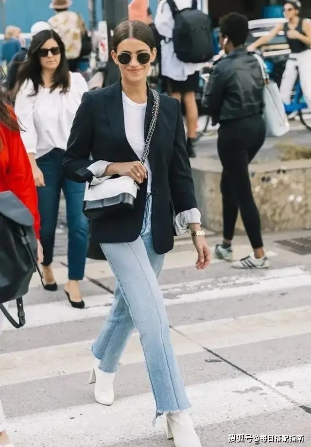 浅蓝色的直筒牛仔裤设计是比较简单的,牛仔元素相对比较硬朗,也很百搭,还很经典。在搭配的过程当中可以遵循简洁的原则,展现出一种春日的活力,同时又不失气质。上半身搭配一件白色的t恤以及条纹款式的西装,很有气场,既潇洒又完美地展现出了身材的曲线。