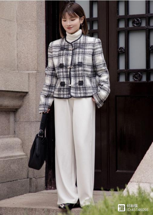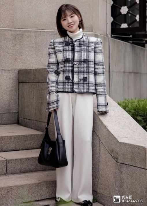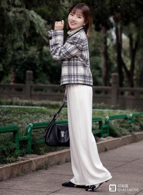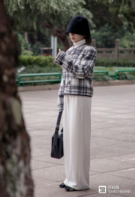 阔腿裤的款式也很多,大家不要总是局限于一种,像下面这种白色的阔腿裤也是冬季很流行的,而白色的裤子在一年四季都可以穿,非常的轻盈,像博主选择了白色高腰阔腿裤搭配黑白色格纹的短外套,便能够体现出她的好气质,看上去还挺时尚的。