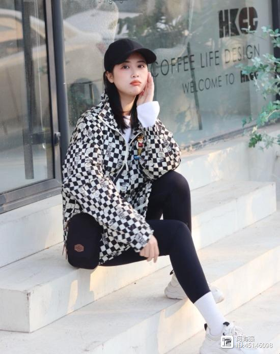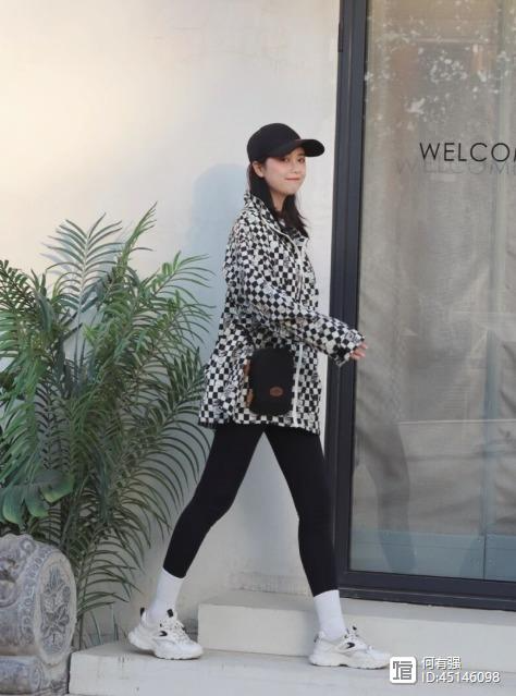 在穿紧身裤的时候,建议大家可以在上面去结合一些短外套,通过宽松的短外套和紧身裤形成明显的对比,便能够帮助你扬长避短。而且像下面的博主选择这件黑白色格纹外套,也可以毫不费力地展现出她的时尚感,看上去休闲又简约。