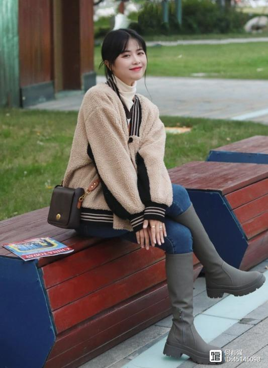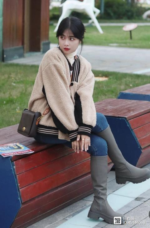 可以看出来,博主搭配的牛仔裤属于高腰的版型,和短款的羊羔毛外套刚好能够衔接起来,让她的大长腿优势展露出来。再加上内搭了一件修身的针织衫,也可以更好地提升她的腰线,看上去身材太好了。