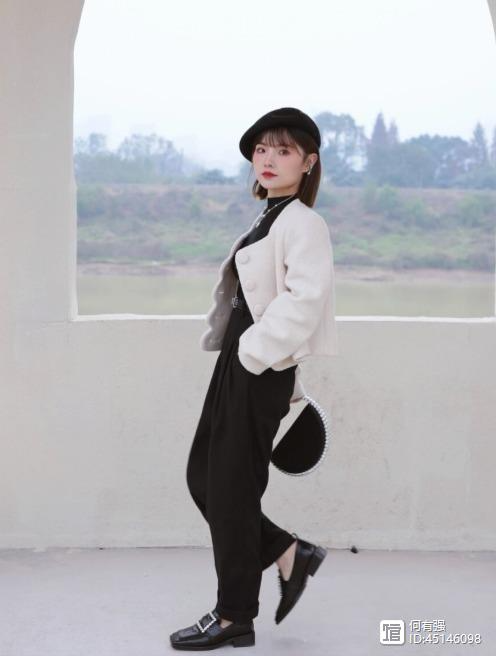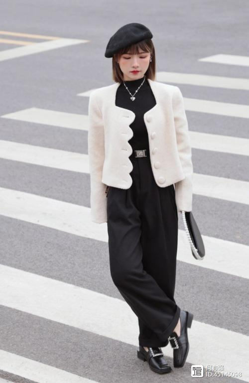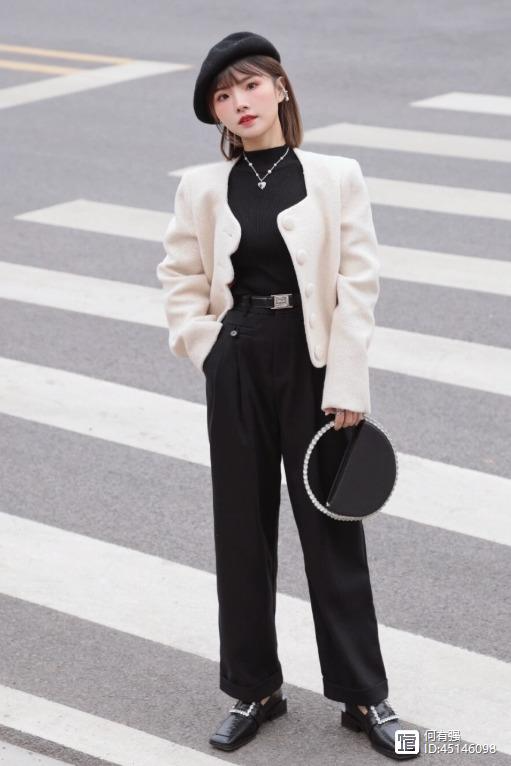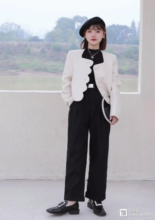 像下面这位博主选择了白色的短外套搭配黑色高腰阔腿裤,看上去简单又时髦,而且能够让它的小蛮腰展现出来,再加上下半身还搭配了皮鞋,也展现出了满满的复古感。