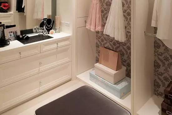 小型衣帽间装修效果图在这个小型衣帽间中通过分门别类因应各式需求,融入了梳妆台的机能巧思,成就满分设计。