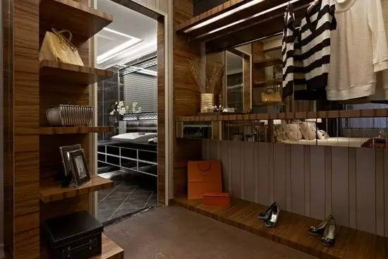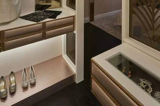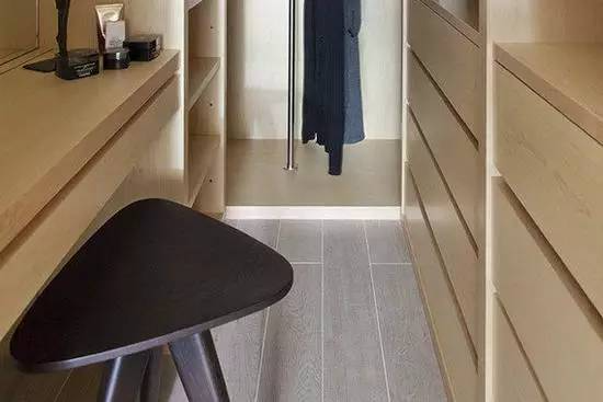 这个衣帽间采用的是分层设计,这就让衣物收纳更有效率,从衣物、鞋子、配件都适得其所。