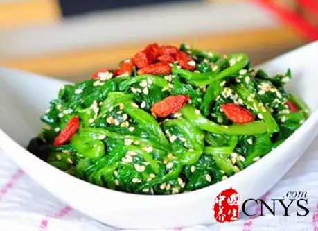 做法:菠菜去根洗净,在开水锅中滚烫一下,捞出浸入凉水中,凉后捞出淋干水分,切成段,放入盘内,分别加入盐、味精、香油,搅拌均匀,再将芝麻撒在菠菜上即可。