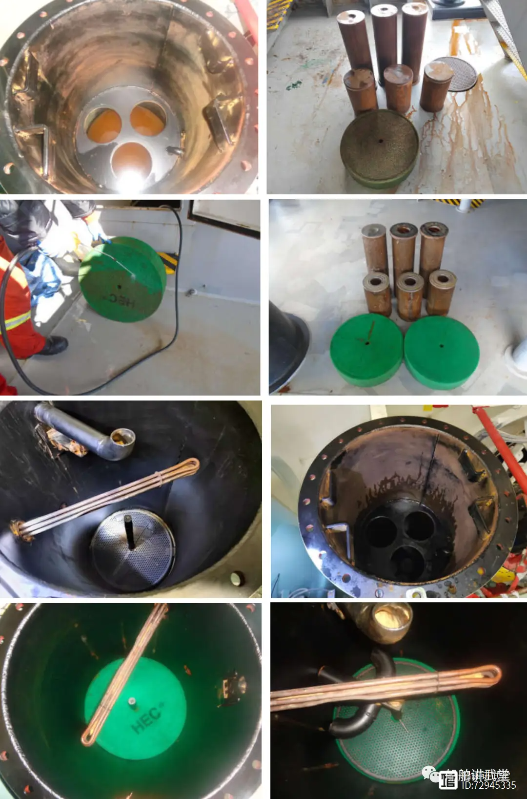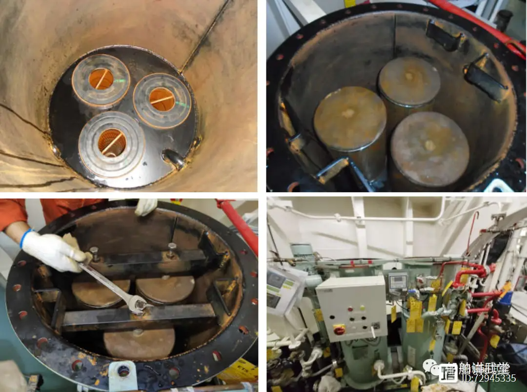根据我对本轮油水分离器以及舱底水柜的了解,我猜测油水分离器八成是脏了。这个德国SKF产的油水分离器,过滤性能极好。OMD油分浓度探测单元性能很稳定,公司二年半强制换新,到目前也只有半年左右的时间。至于油水分离器脏,脏的直接源头应该在于舱底水柜,污水井平时都很干净。之前在我遇到的案例中讲过,本轮舱底水柜的透气管,主机曲轴箱以及其他好几个带油的透气管被神奇的连接到一根管子上,这就给舱底水柜有少量含油埋下了伏笔。随后机舱大家伙齐上阵,先放残本体内部残水,一起拆解油水分离器,将油分离器的滤芯拔出清洁。