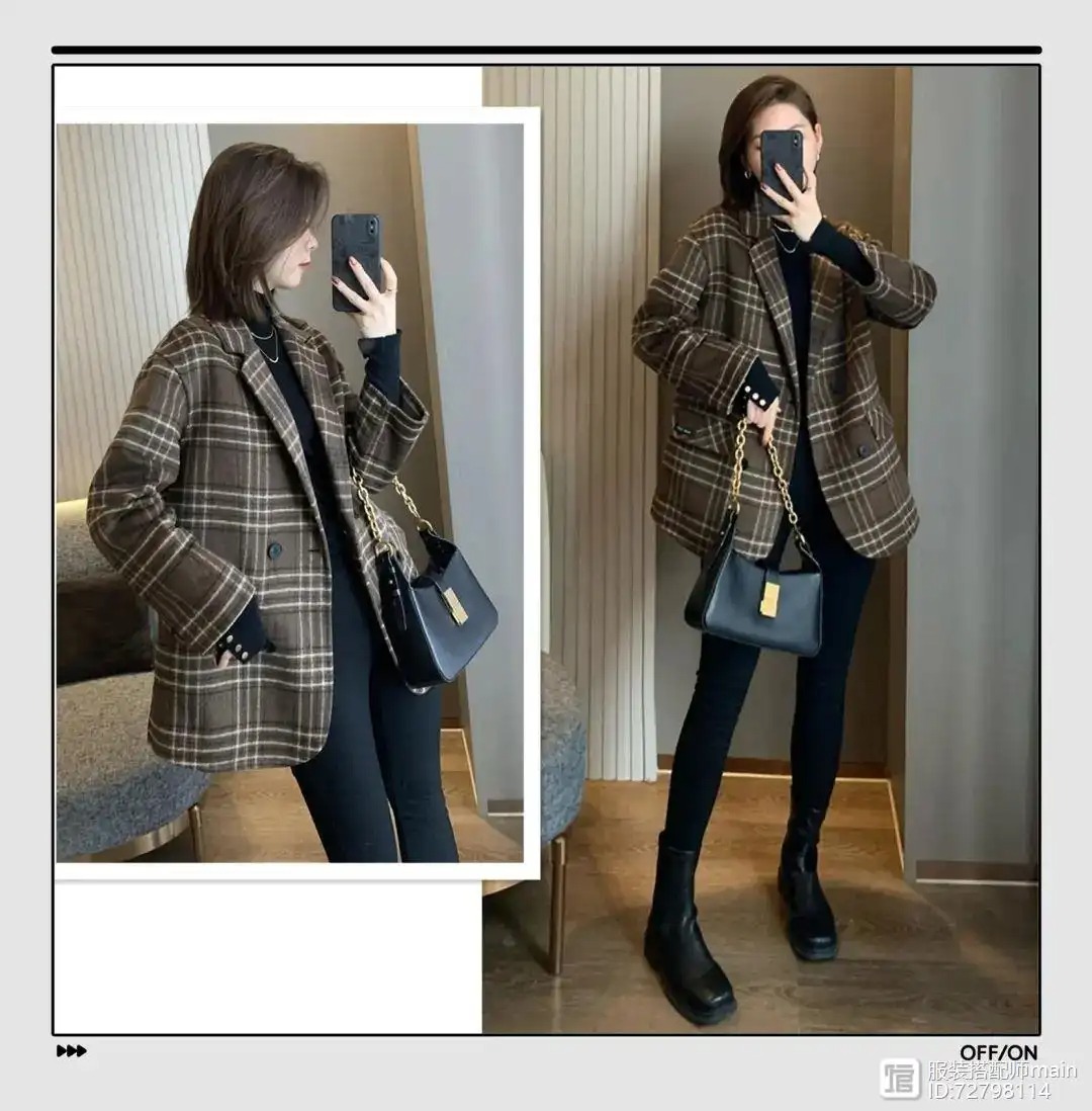 格子花色的西装很特别,不显死板还很活力,穿它不用担心会显老气。在垫肩的修饰下人人都是直角肩。