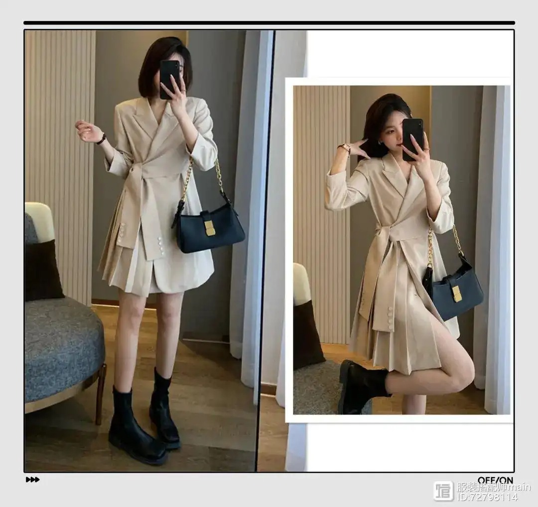 这件西装裙,苹果型女孩可以提前备上一件,腰部做了绑定设计,掐出小蛮腰,不管是通勤还是日常都完全可以驾驭。