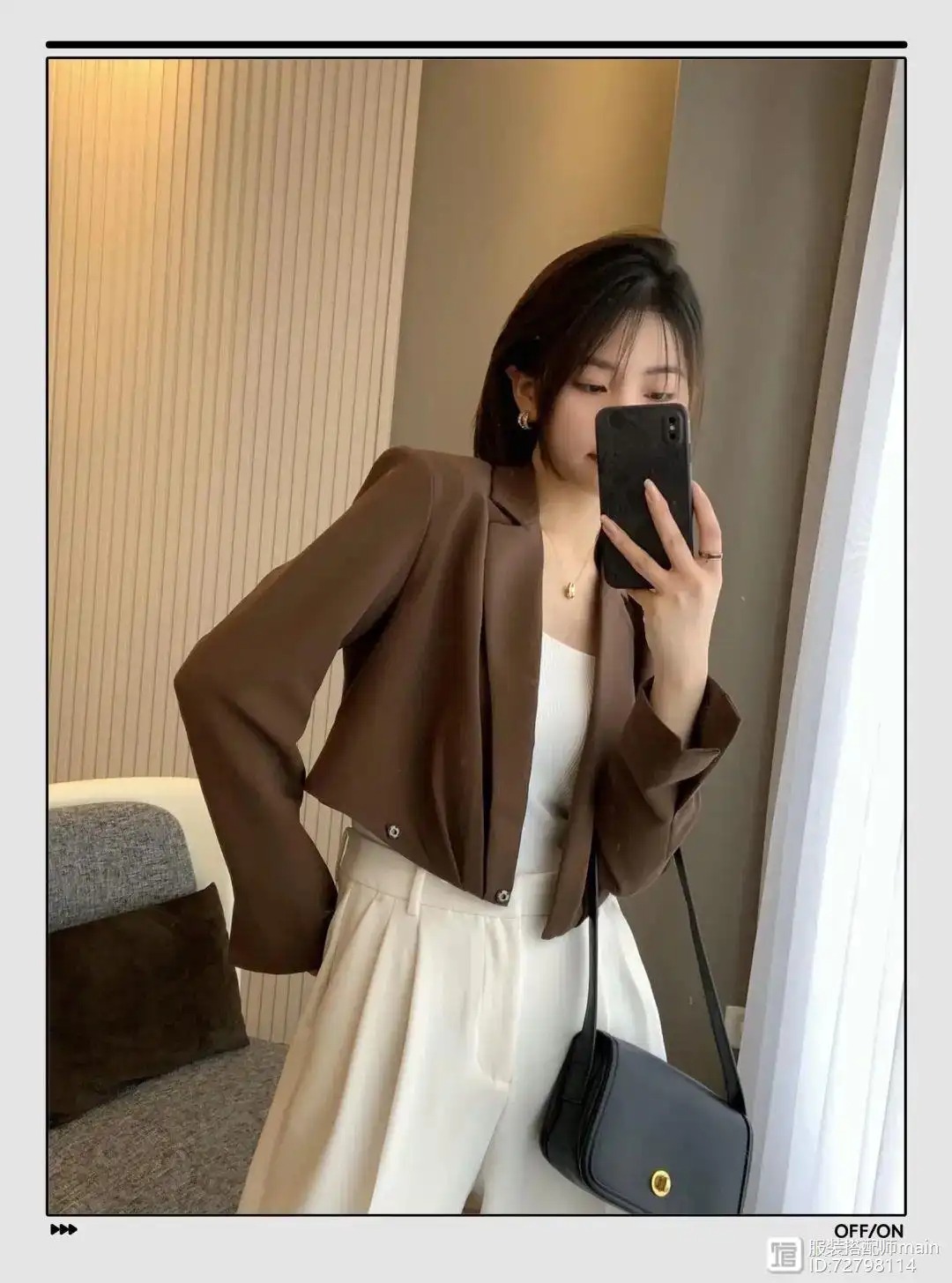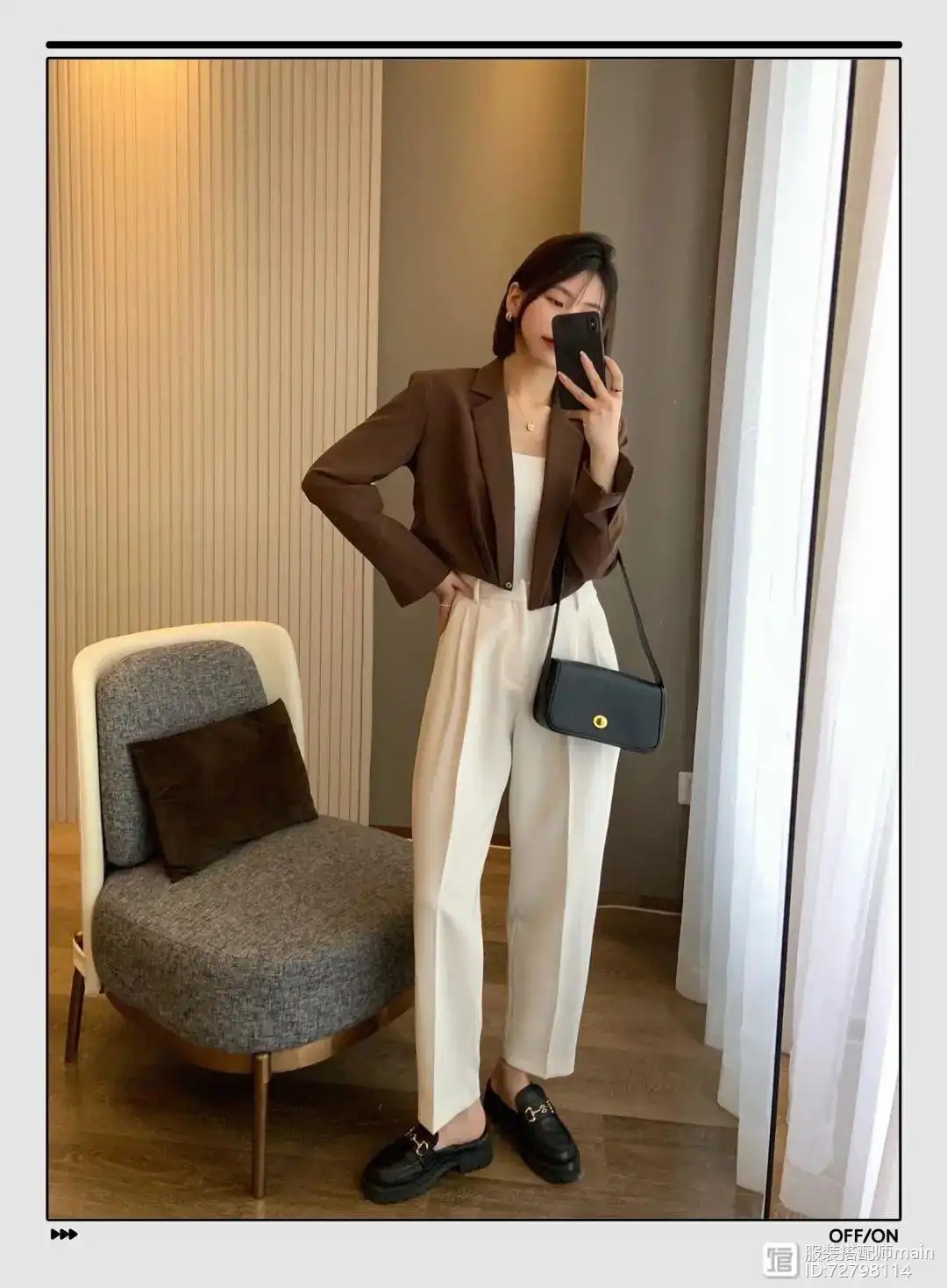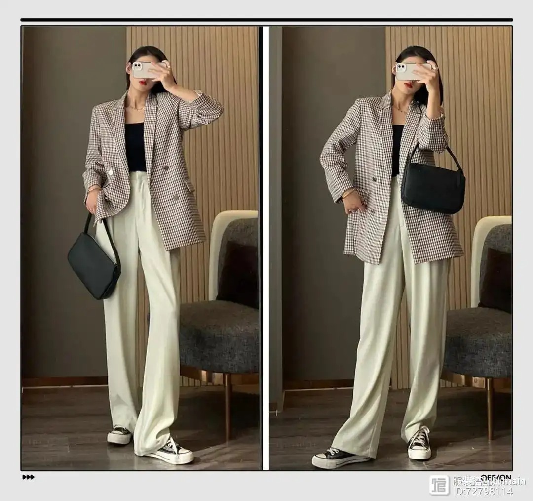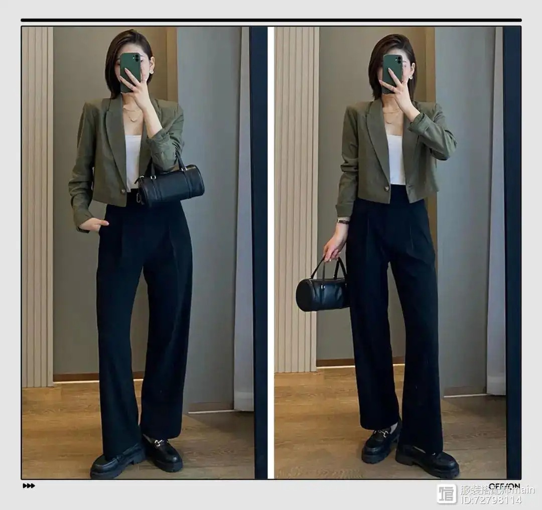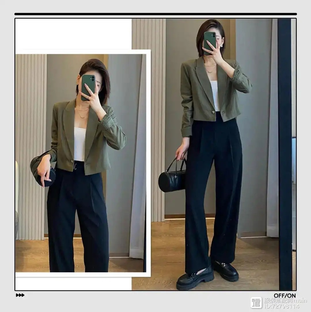 身材娇小的女生最需要的就是显高,短款西装最适合了。用短款西装在视觉上缩短上半身,搭配高腰裤延伸下半身,显高其实并不难。