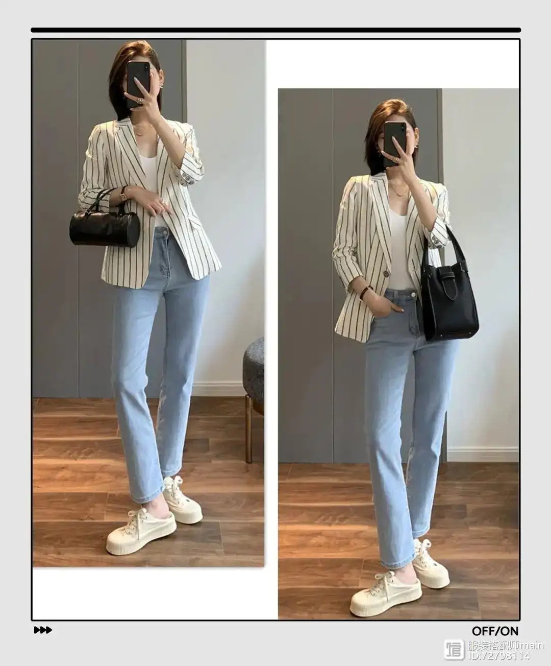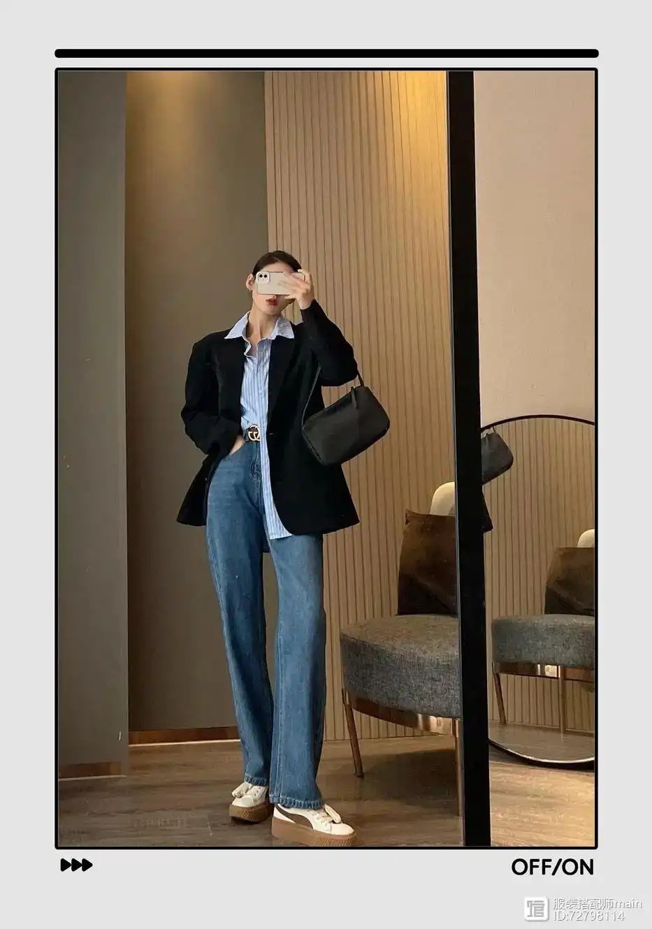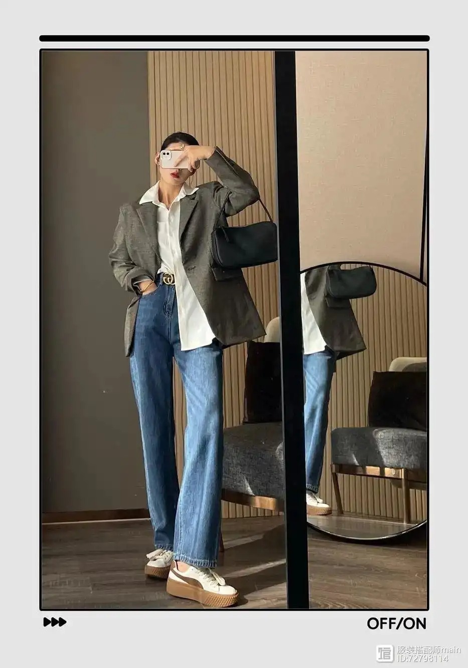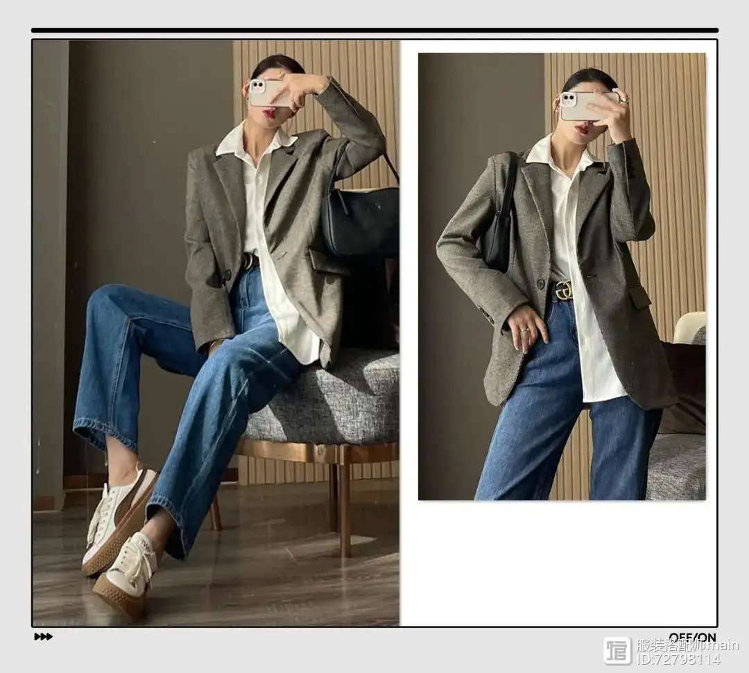 廓形版型+垫肩的西装除了专治各种肩型外,还是很好的显瘦利器。搭上一条高腰牛仔裤,轻松穿出瘦高身材。