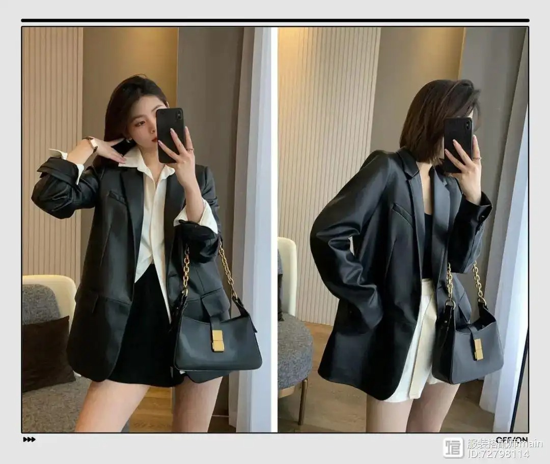 这件PU面料的西装一上身真的是又酷又A。环保的PU面料,柔软舒适,丝毫不闷。