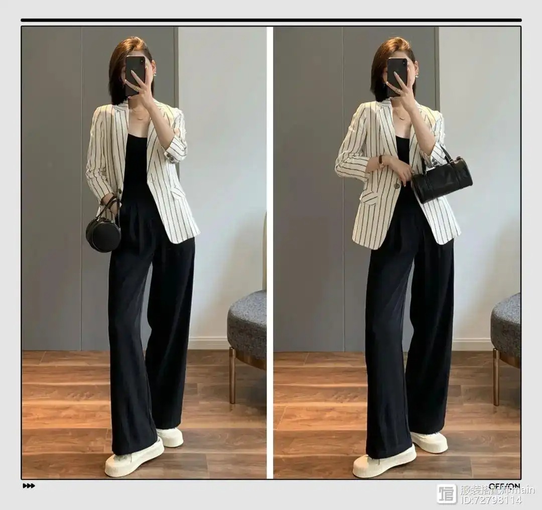 除了系腰带,收腰版型的西装也很好穿,配上竖条纹,还能拉长上半身的线条。