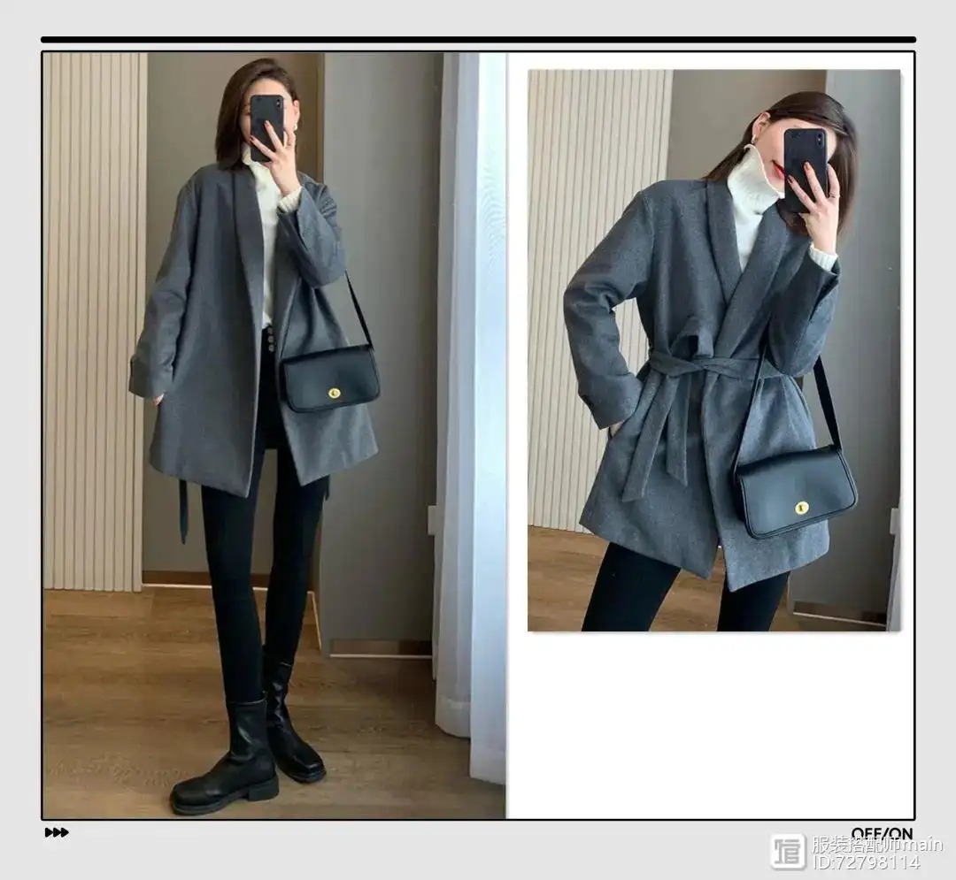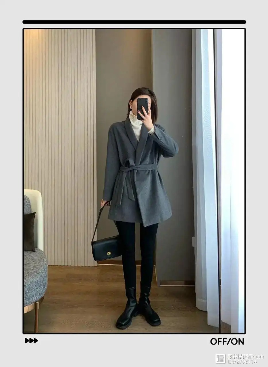 灰色的毛呢西装现在穿刚刚好,附带了一条腰带,天气暖时敞开穿休闲随性,系上还能制造腰线。