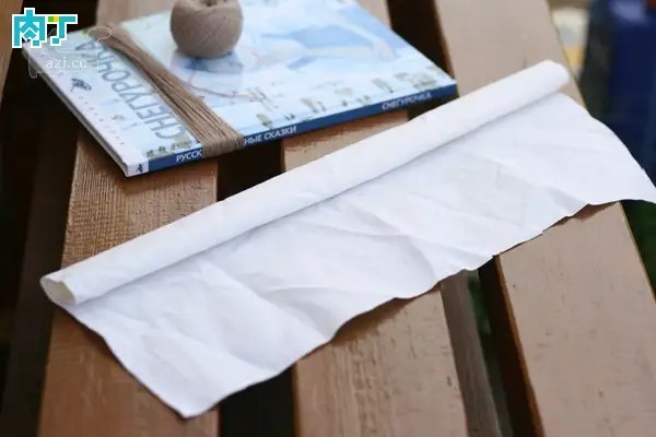 把白色布滚成圆筒状。