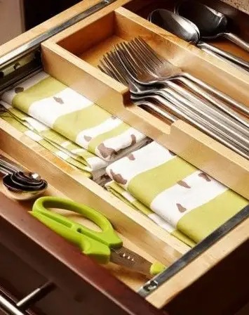 懒人使用家庭收纳:分层的抽屉可以很好的帮助你进行餐具的分类和收纳,这种抽屉中还有抽屉的设计,一方面可以减少橱柜拉门的数量,增加橱柜的美感;另一方面可以将一些需要同时使用的物品都放置在一起,拿取的时候也方便,不用来回的拉扯抽屉。