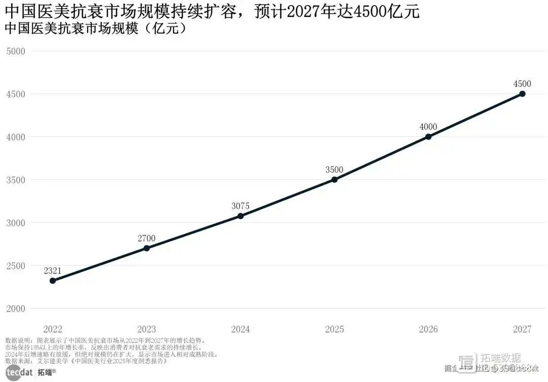 医美市场中,抗衰赛道是绝对的“增长引擎”——2024年市场规模达3075亿元,预计2027年将突破4500亿元,年均增速保持15%以上。这一增长来自“两代人群”的需求叠加:18-23岁Z世代主打“抗初老”,偏好光子嫩肤、酸类焕肤等“无创、恢复期短”的项目(TGI指数高达379),把医美当成“日常保养”;31-40岁熟龄肌则追求“深度抗衰”,热玛吉、超声炮等项目需求旺盛,推动高端医美市场(客单价5000元以上)增速达22%。