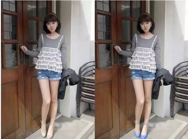 第七招:裸色单鞋,牛仔短裤本身就显腿型,再加上裸色的鞋子比蓝色的要更显腿长。