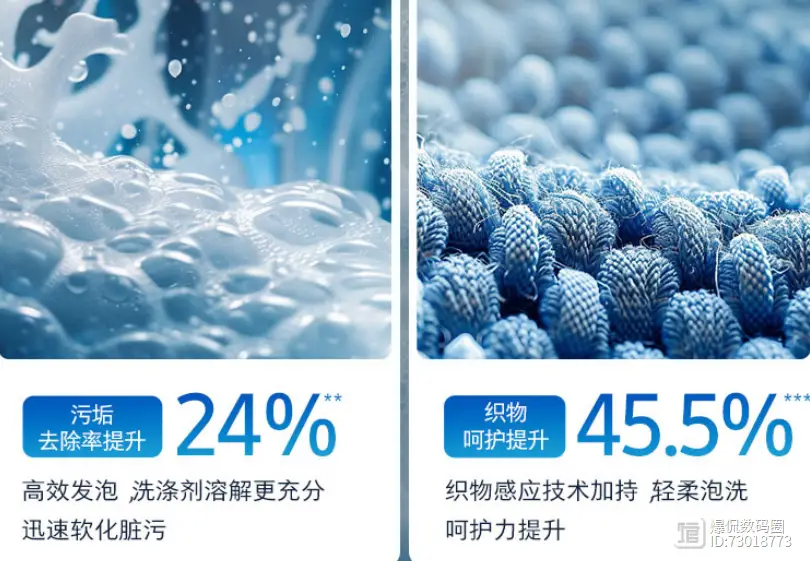 其核心亮点在于AI泡泡净技术,将洗涤剂转化为细腻泡沫,深入纤维瓦解污渍,减少衣物磨损和褪色。配合蒸汽除菌功能,可有效杀灭99.9%的细菌和螨虫,特别适合母婴家庭或敏感肌肤人群使用。内置BLDC变频电机,运行稳定安静,脱水转速达1400转/分钟,脱水效率高且噪音低至52dB,夜间使用更安心。