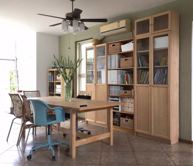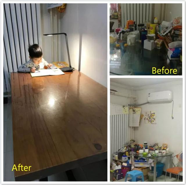 东侧则改成一张大桌子,一家六口终于可以一起吃饭了。吃完收拾一下,老大可以写作业,老二虽然才三岁,都有样学样地开始学习了!