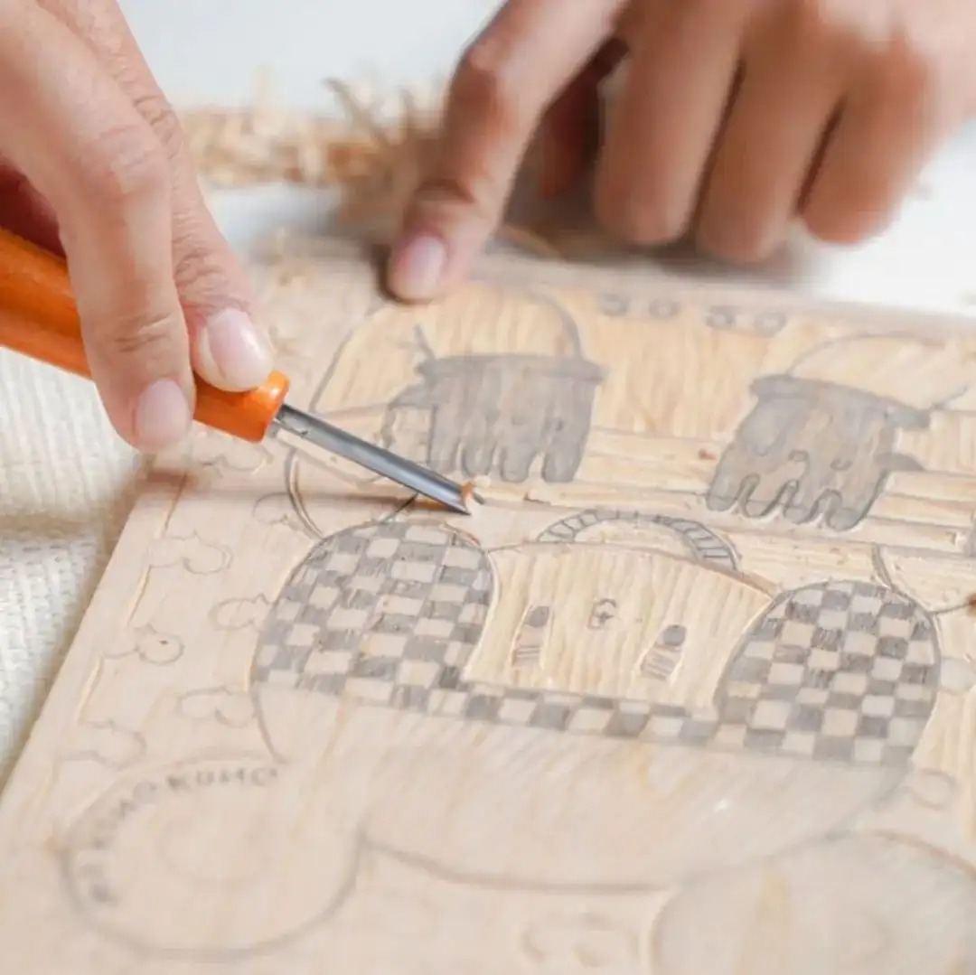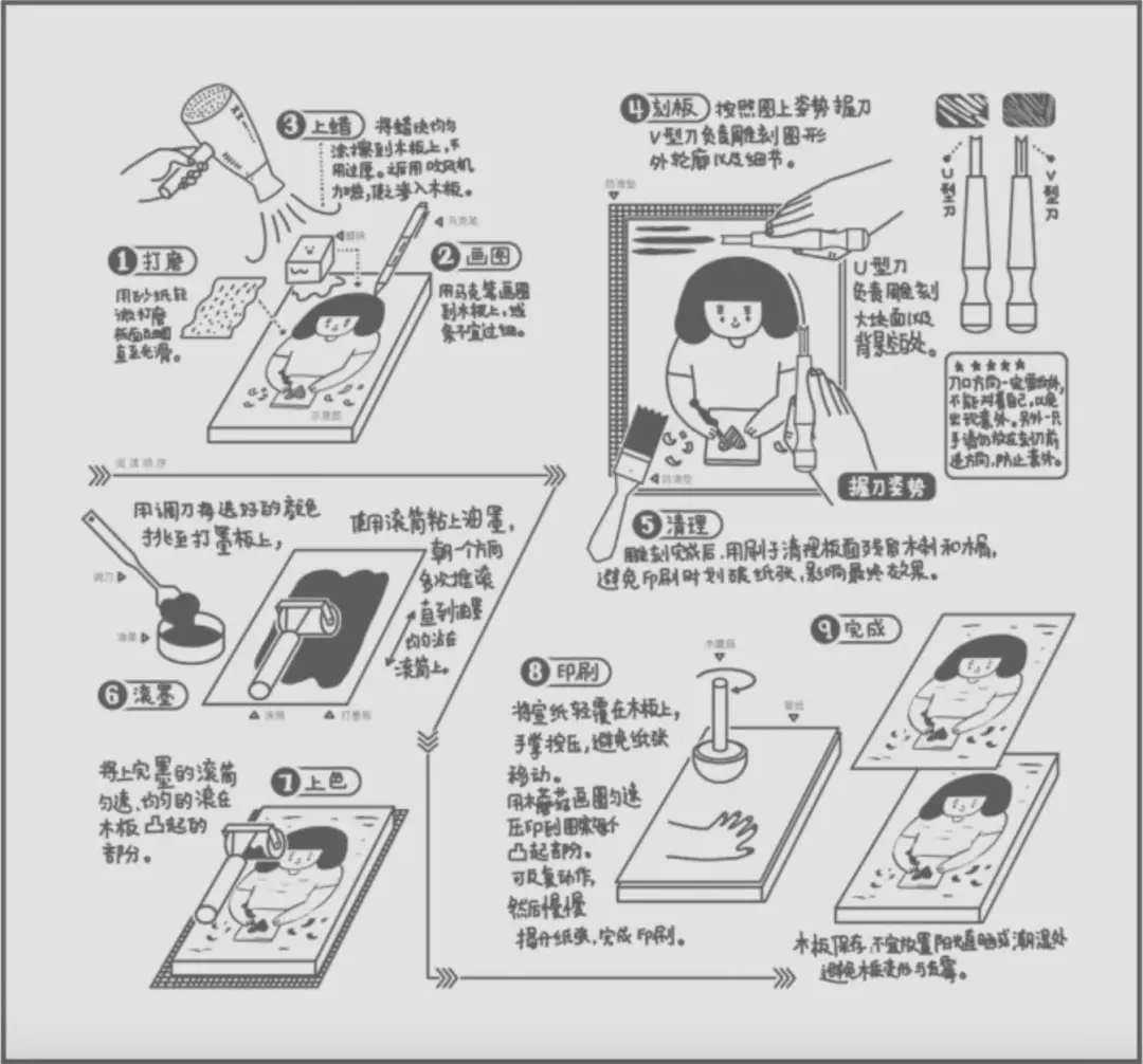 有人说这是一场木头与刻刀碰撞的艺术,在翻飞的木屑中,用不同的力度与深浅打磨图案的轮廓与细节,木板上呈现反向图案后,再上色,印在纸上。