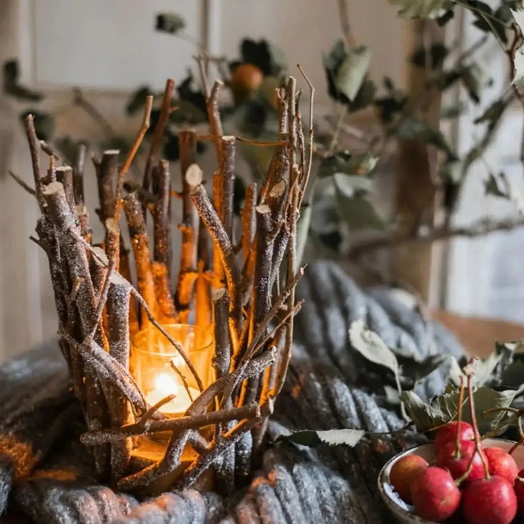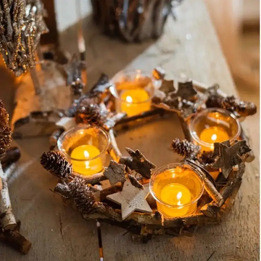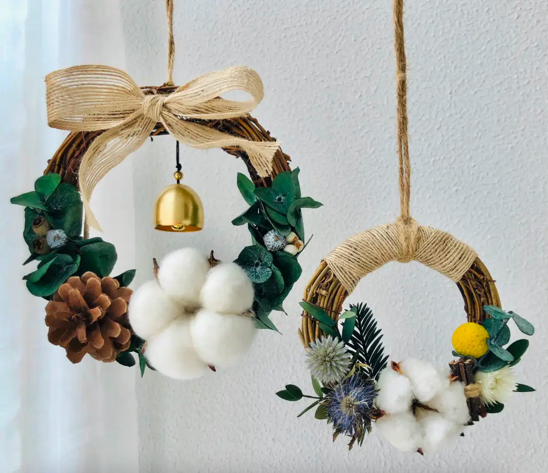 除了干木柴制成的烛台,种类丰富的干花也能制作超好看的摆件,比如做一个超有冬季过节氛围感的草木花环,叮叮当当,敲响新年的钟声。