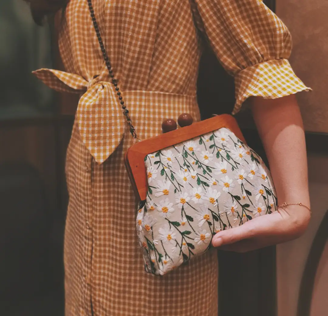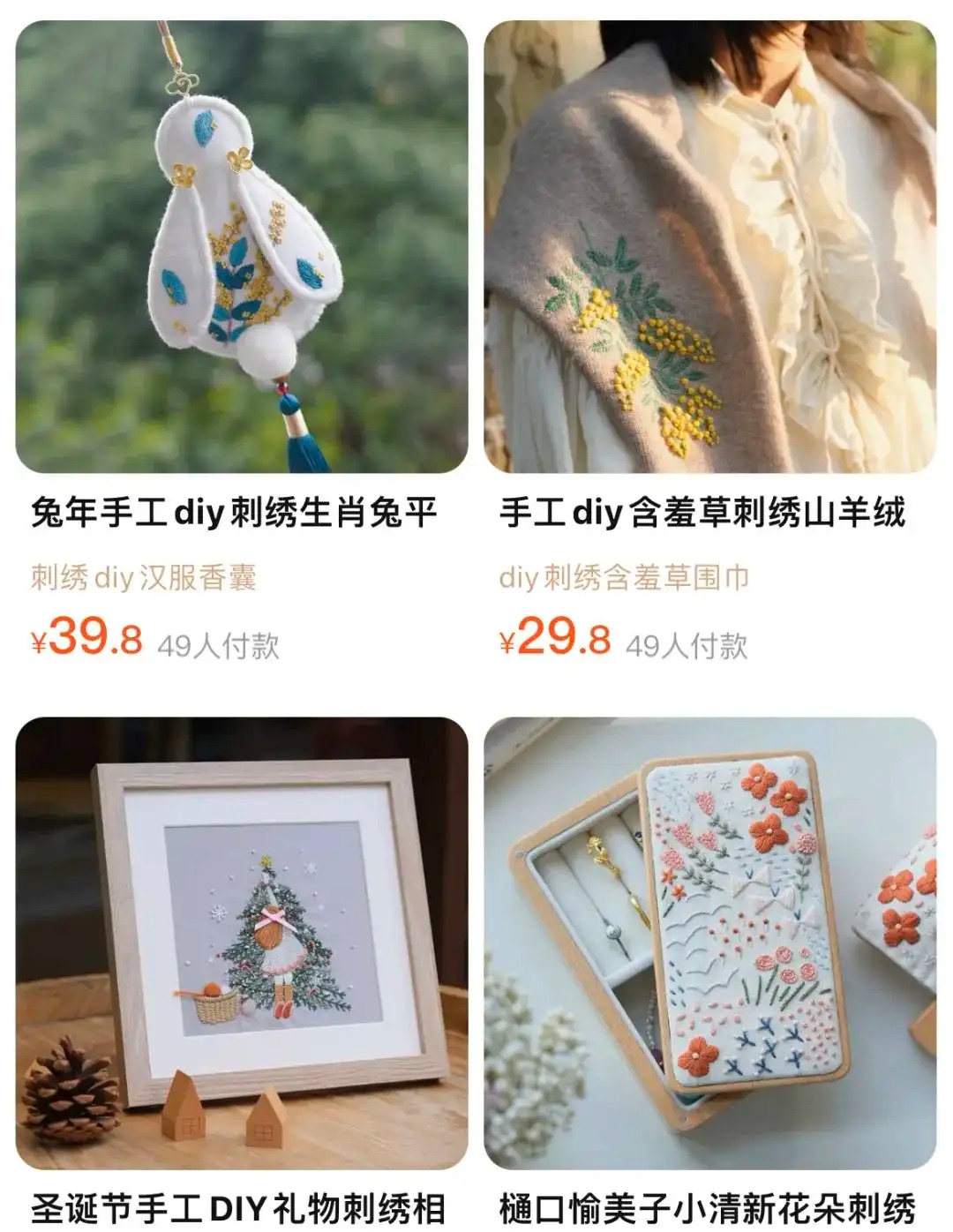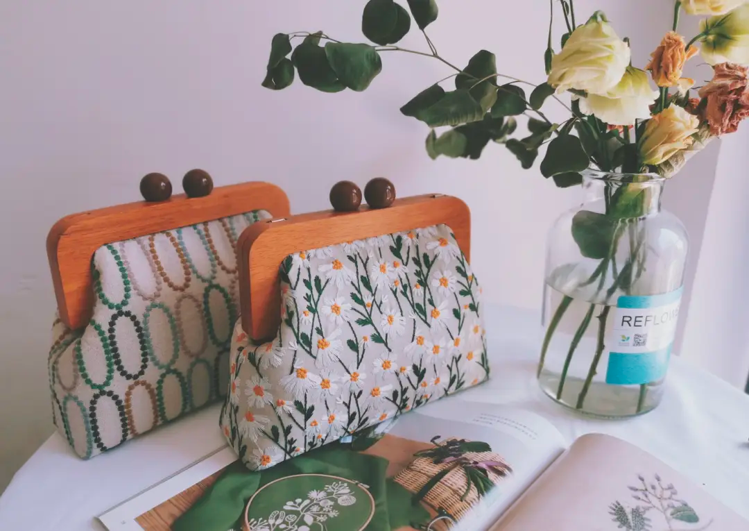 比如刺绣小包、刺绣手帐本、刺绣围巾、小香囊等等,配色清新自然,图案隽永小巧,是拿出来就能让人感叹精致的那种。