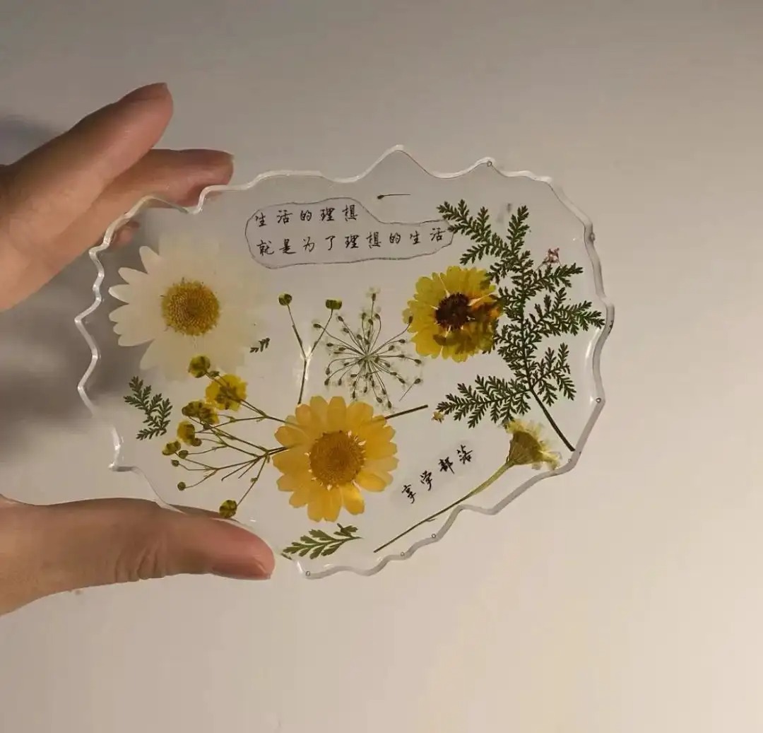 想要简单又好操作的,可以试试这款滴胶杯垫,把各种干花根据自己的喜好摆放位置,保留在滴胶内,创造出独一无二的作品。