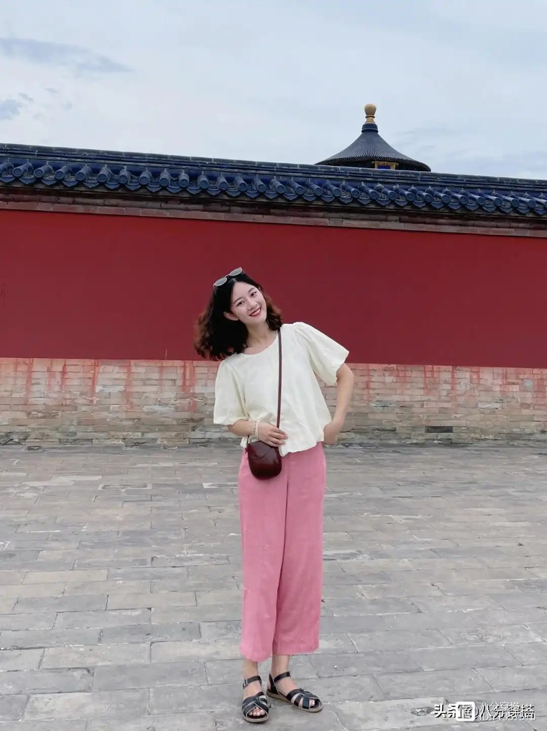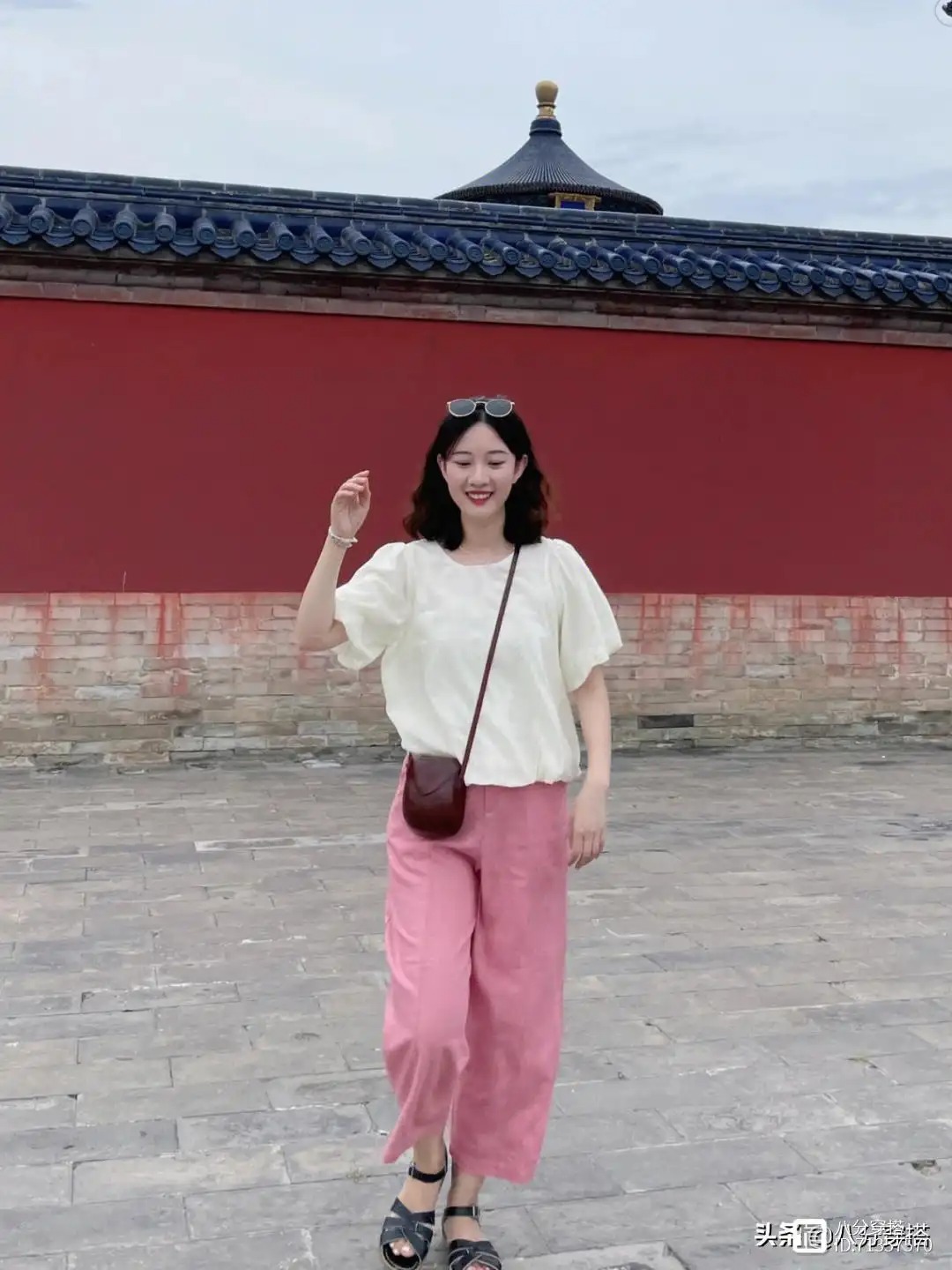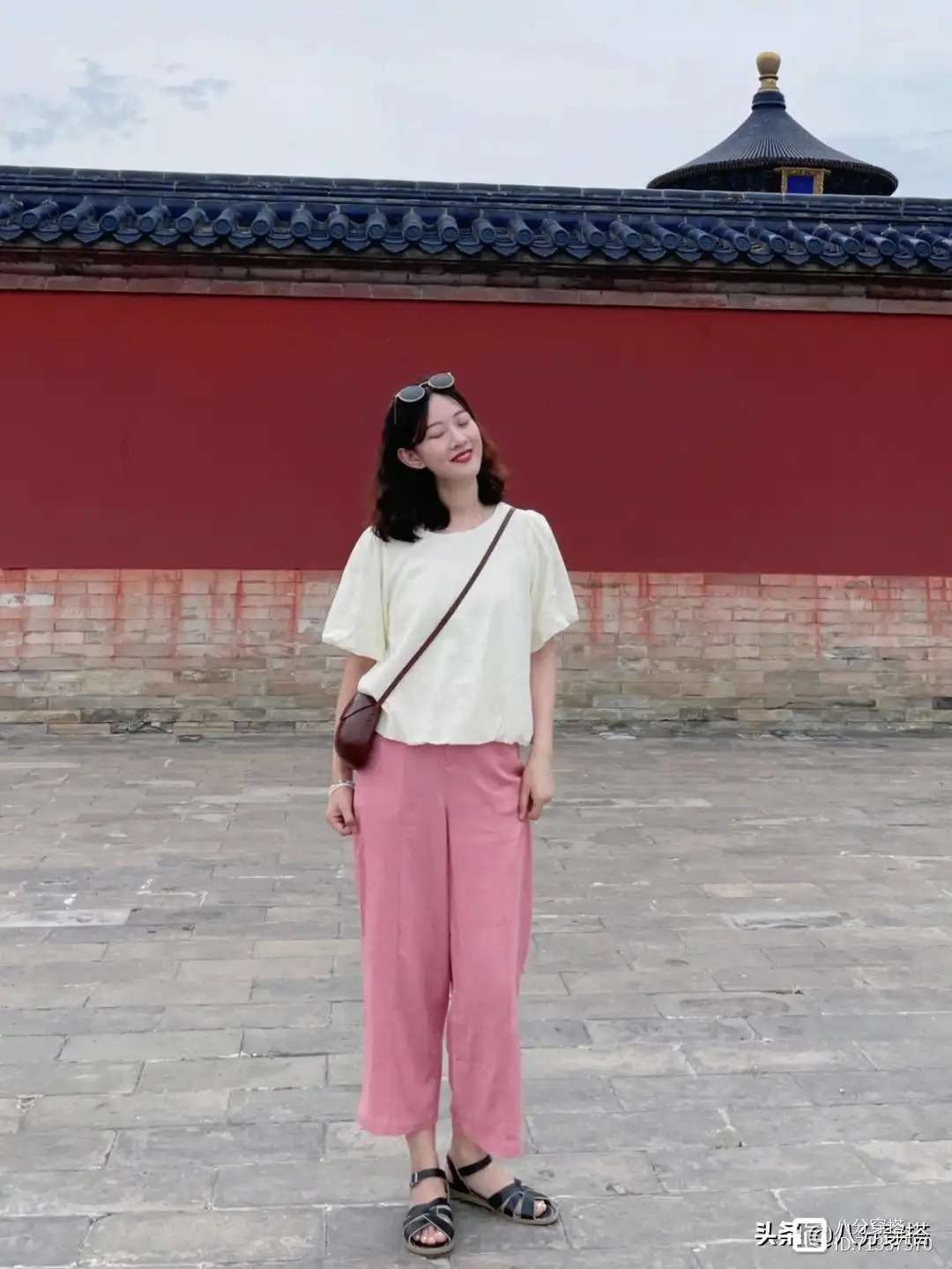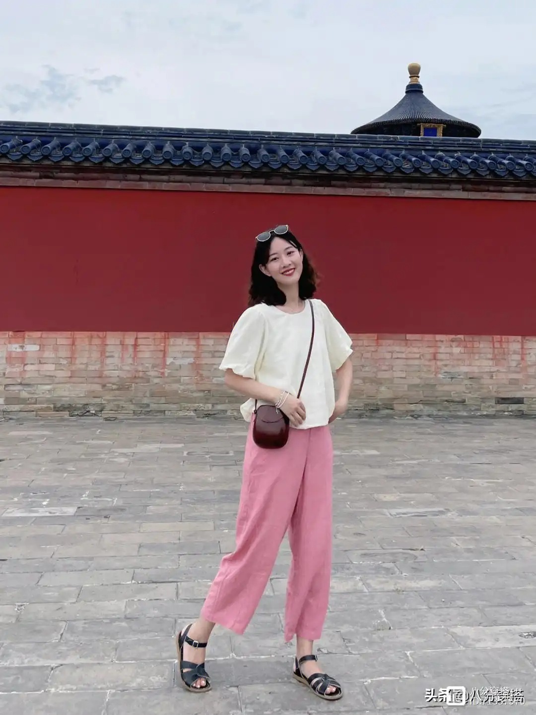 这件白色的上衣采用的是圆领的设计,可以修饰颈部的线条,更加紧密一些,袖子借住了一点点泡泡袖的设计,会带有一点蓬松感,增加甜美温柔的气质,下半身的这一条粉色裤子,裤子酷酷的设计,穿上身之后清凉舒适又透气,而且对于胯宽腿粗的梨形身材女生来说也有很好的包容性,住的时候只需要简单的搭配上一个斜挎包和一双凉鞋就能够出门了,清凉舒适又不失活泼魅力。