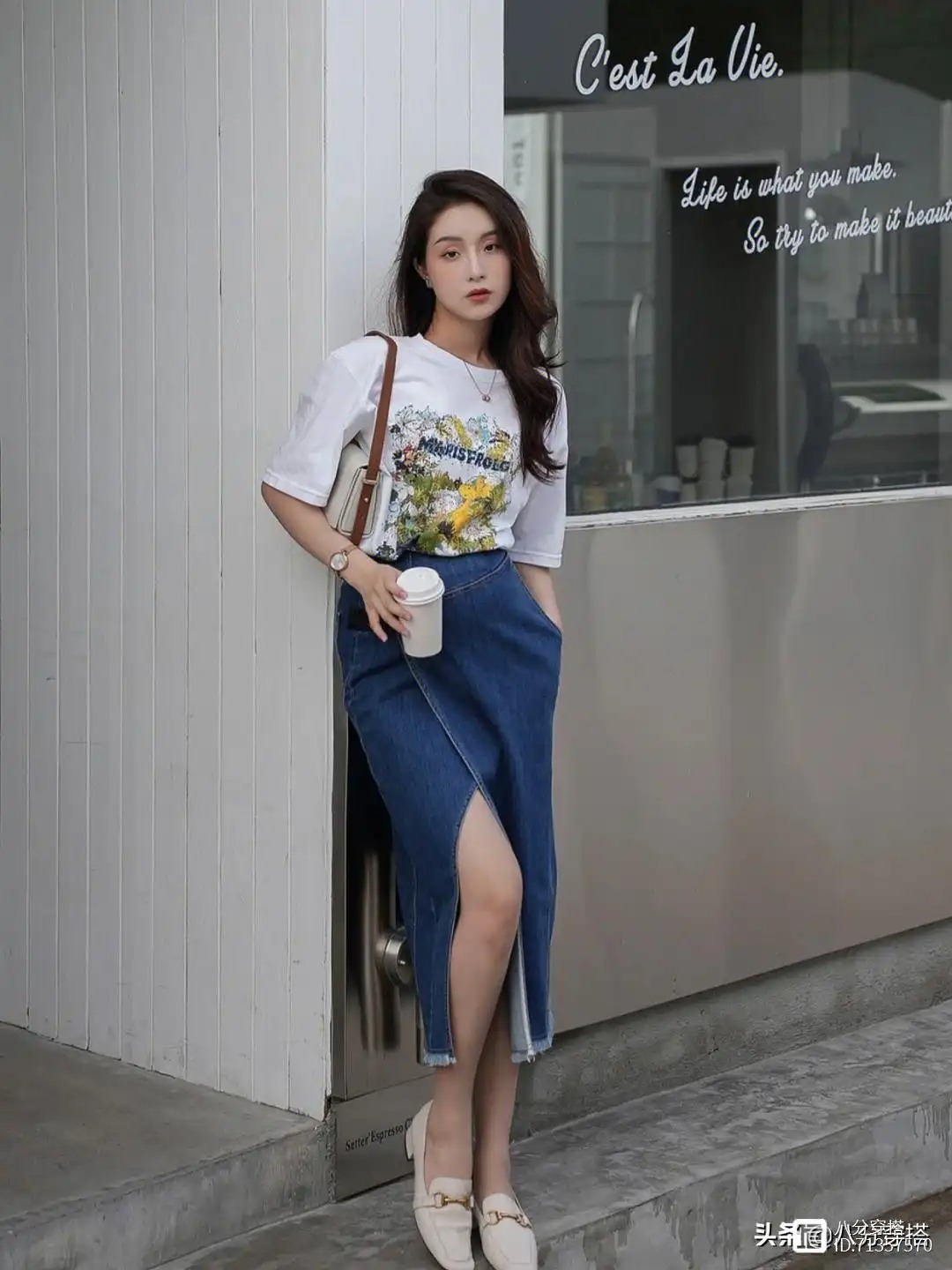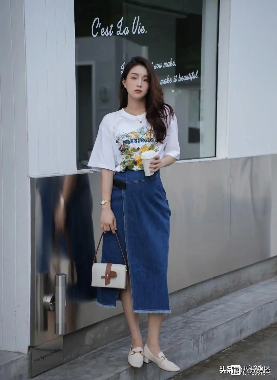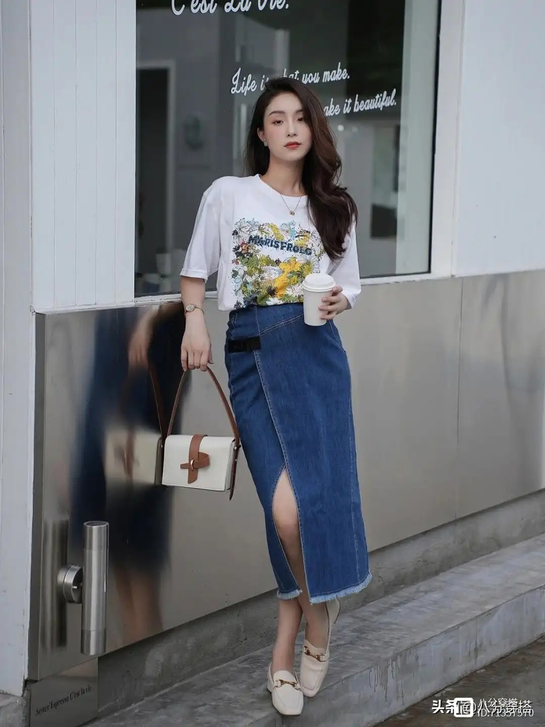 T恤是我们生活中非常常见的时尚单品,简约随性又百搭,选择这样一件印花的白T恤可以打破单调,带来一种清爽俏皮的时尚韵味,下半身用一条开叉的深蓝色牛仔半身裙进行搭配,简约大方又以修饰我们下半身的线条感,更加的利落大方,脚上也踩着一双白色的高跟乐福鞋,更加彰显出成熟女性的优雅与精致魅力。作为职场穿搭也是比较舒适简约的。