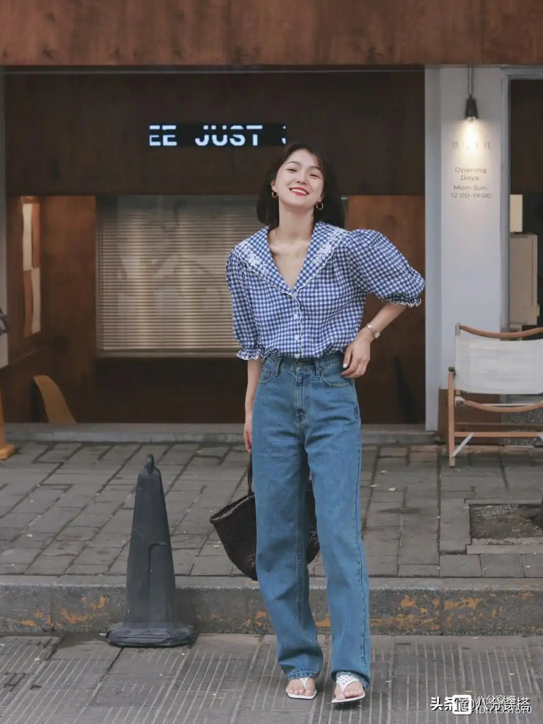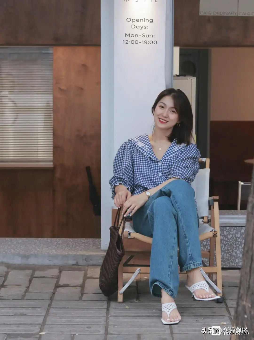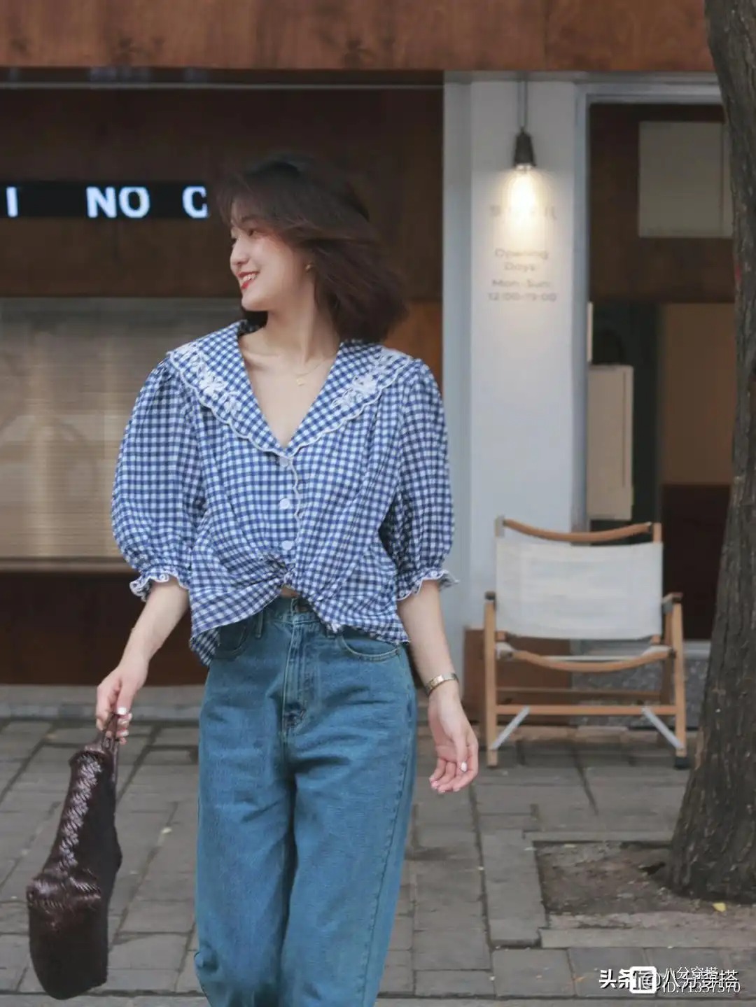 这件格纹的上衣借助了一点法式的领子设计,还有小花边的元素进行点缀,格外的温柔甜美,这总体上形成一个V领的设计,所以可以拉长我们颈部的线条感,这个时候,在搭配上一条项链来修饰苍白的脖颈部位,不仅更加有层次感,也会让整体造型看起来更加的精致细腻一些,下半身只需要一条简单的牛仔裤即可穿出满满的优雅温柔感。
