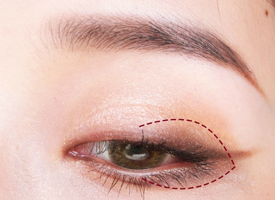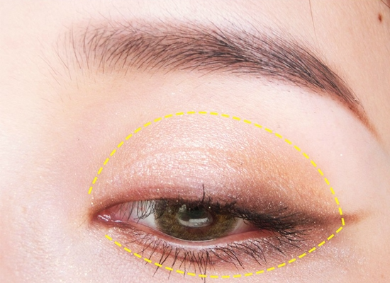 选择金棕色眼影,用晕染刷沾取,大面积刷在眼皮上,范围如图所示。