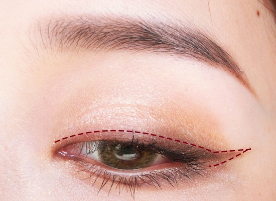 棕色眼线胶笔画一条外眼线,用棉棒将边缘晕染自然。眼线的样式如图所示。