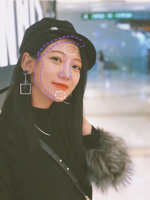 所有紫色的部分(脸颊两侧、发际线部分、鼻侧影)都用棕色阴影粉