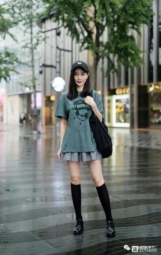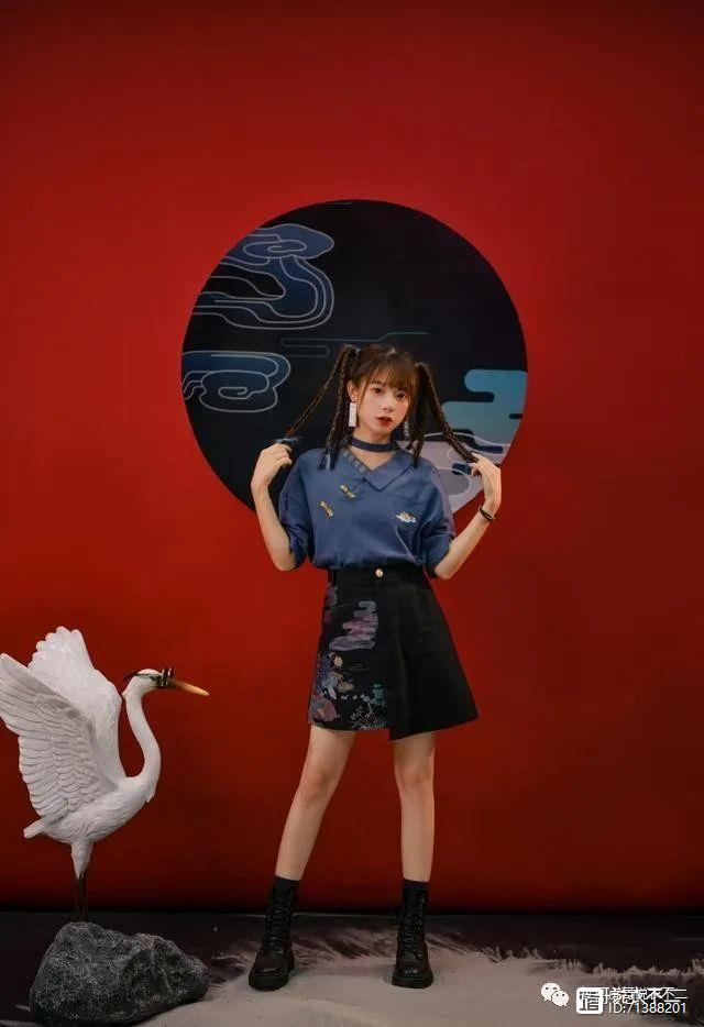 这套衣服也是非常典型的T恤加短裙的搭配,只不过设计感要更加强烈一些,整体带有非常浓郁的中国风特色,因为整套衣服都是深色系,还会给人一种非常帅气的感觉。这套衣服中短裙长度刚刚好,不会太长显得过于压抑,也不会太短而显得暴露,属于非常减龄的一套衣服。
