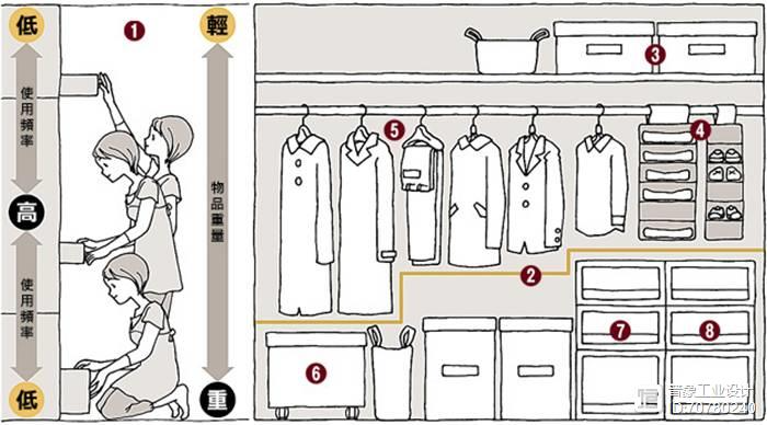 ①依使用频率与收纳物品的重量分为三个不同区域,使用频率低且轻的放在最上,例如被子、枕头;使用频率低又重的放在最下,例如:文件,书本。