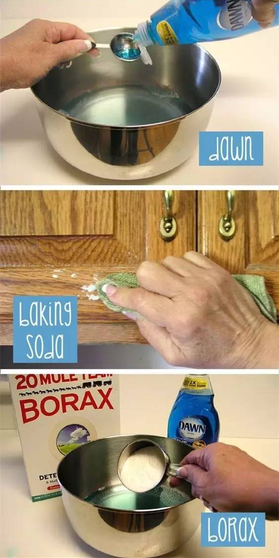 一勺洗洁精、一勺小苏打,一大勺硼砂(硼砂不要也可以),混合在温水里,用抹布蘸水擦拭橱柜即可。