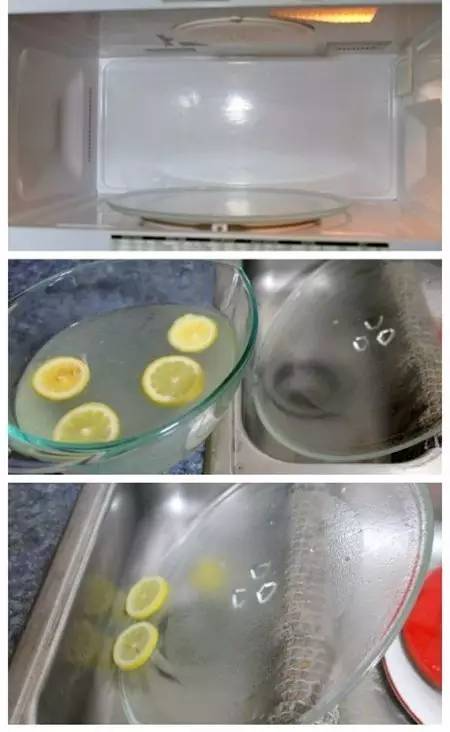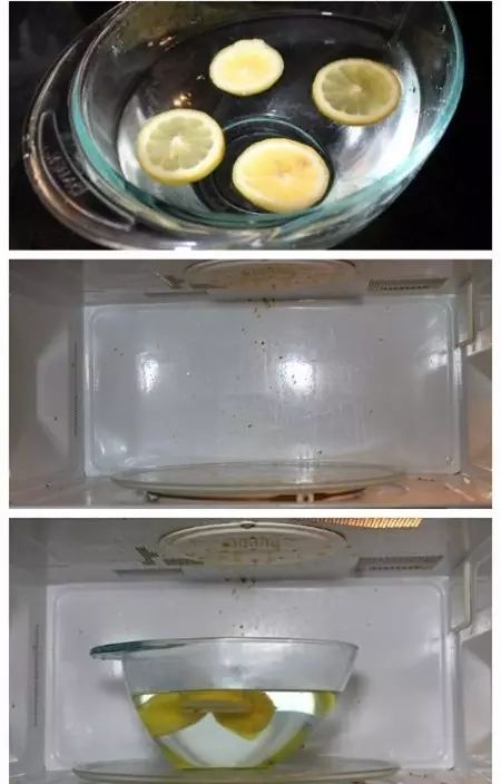 将盛柠檬片的杯子放到微波炉里加热3分钟,待有蒸汽后取出,用柠檬水擦微波炉,肯定干净!
