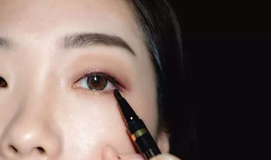 完成眼影后接下来是眼线部分,单眼皮的眼线可以画宽一些,深紫色、墨绿色、深蓝色、深棕色,以及大红色都是可以营造大眼效果,让眼睛更有神采~本教程用了【红色眼线】打底做个样~