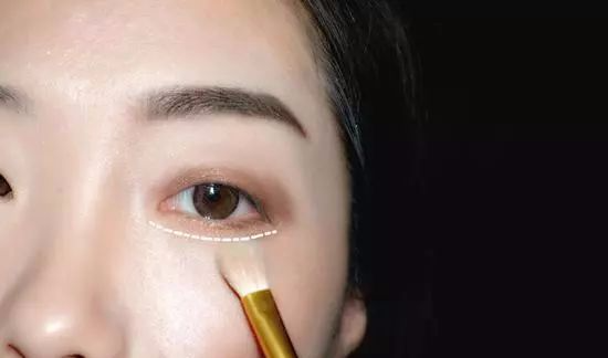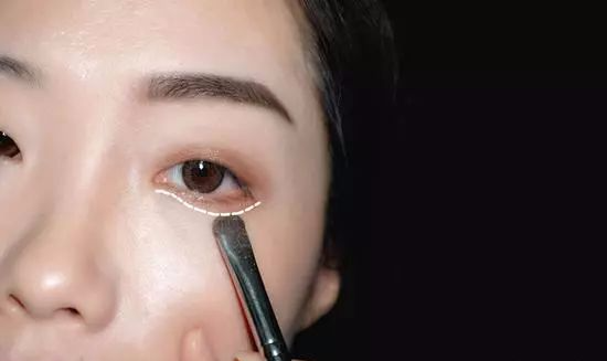 渲染完上眼睑,接下来再用同样的【浅棕眼影】,渲染整条【下眼睑】(如下图虚线所示),在【眼尾】的位置稍微加重,这一步起到修饰放大的效果~