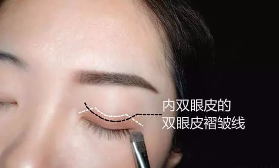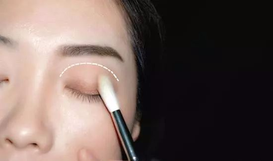 首先选用【浅棕眼影】,渲染【上眼睑】,用内凹的画法,渲染的宽度约为整个眼皮的½。(如下图虚线所示)